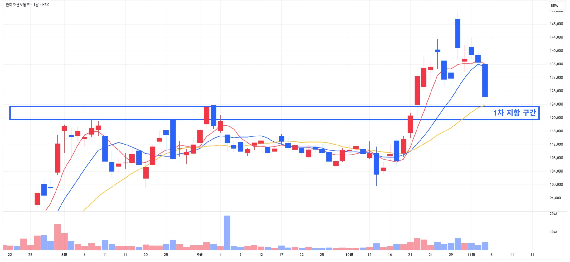 2) 한화오션 : 당일 섹터 전반적 하락세에 1차 저항 구간 근처까지 하락하며 마무리