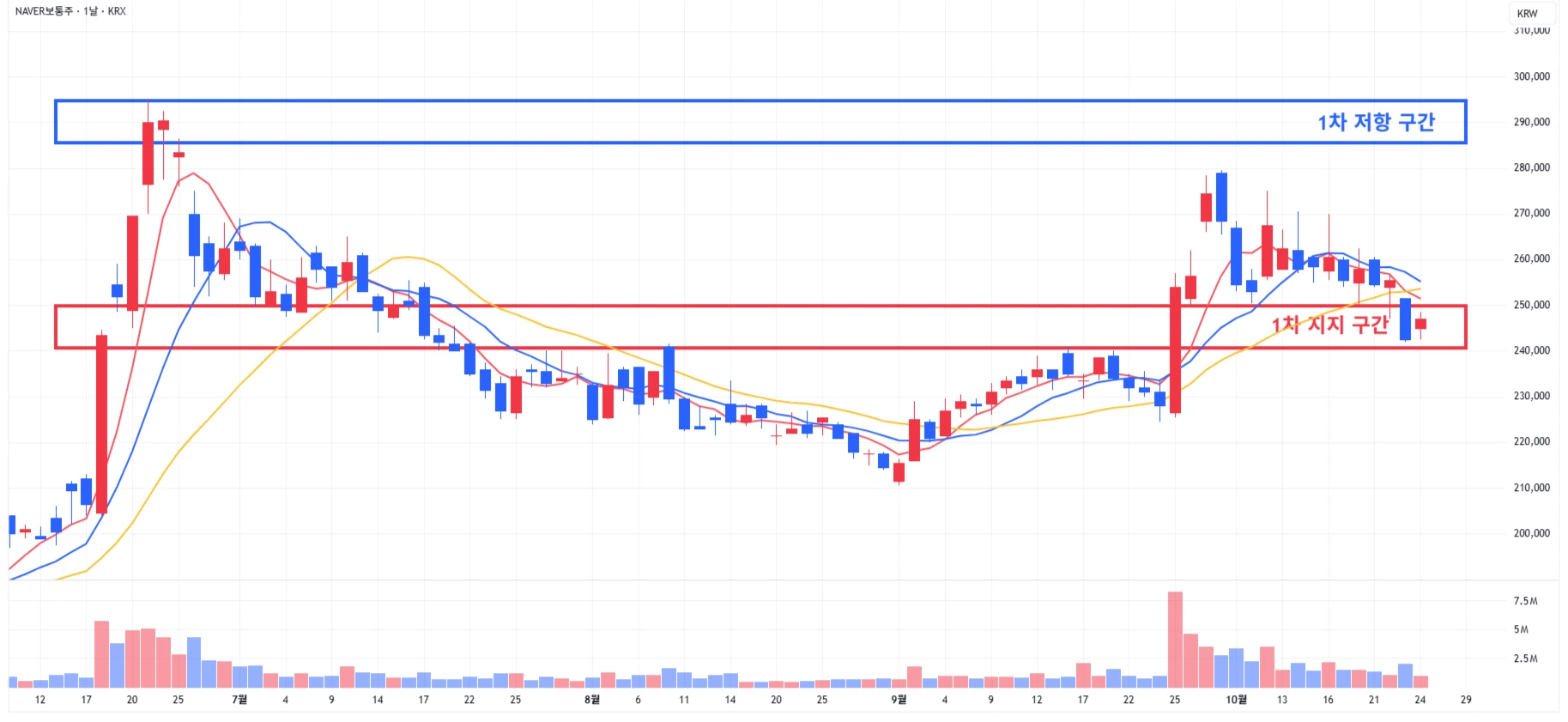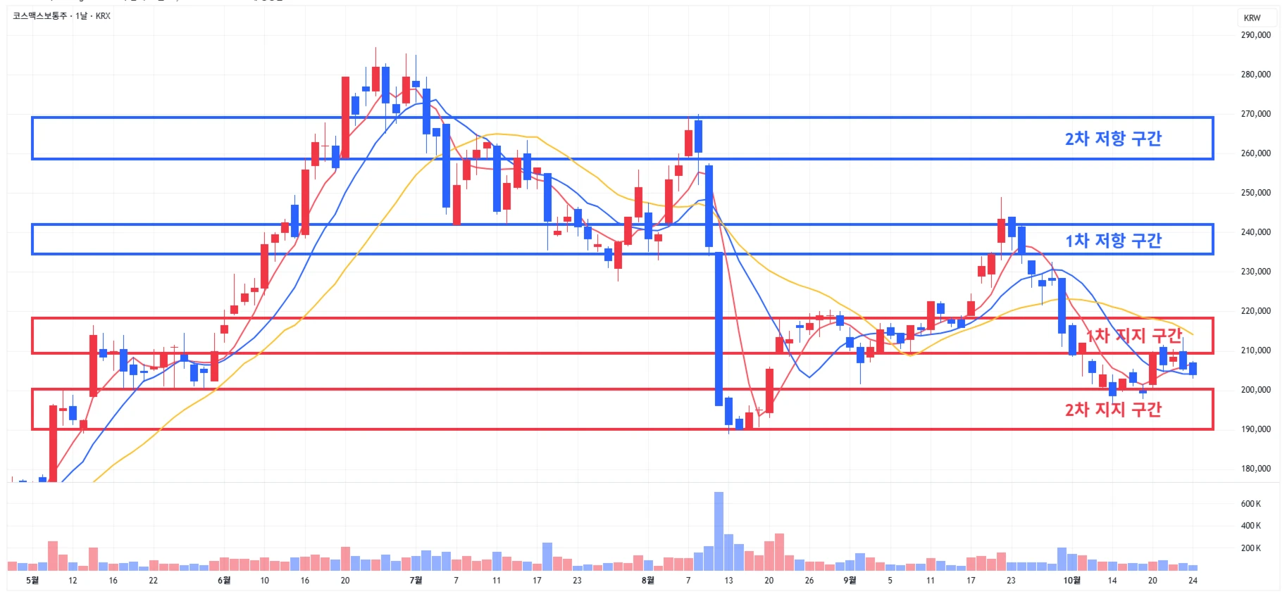 1차 지지 구간 하단 이탈 시에는 일부 물량 손절 후, 2차 지지 구간 도달 시 분할 매수 진행