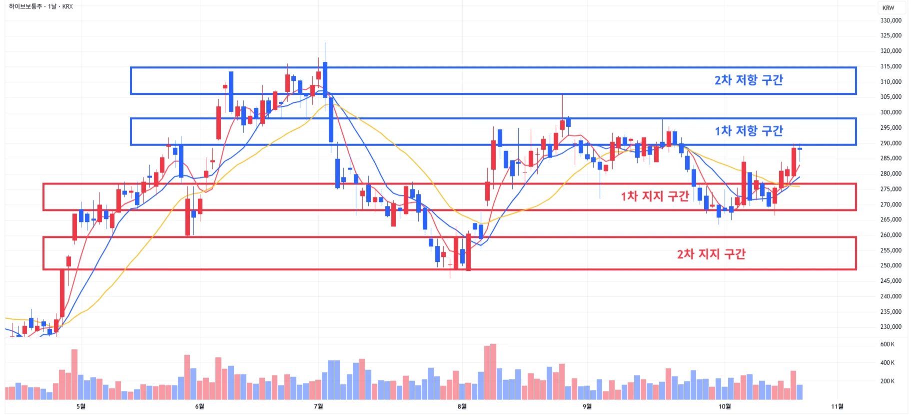 4) 하이브 : 큰 변동성 없이, 당일에도 1차 저장 구간 하단에서 마무리