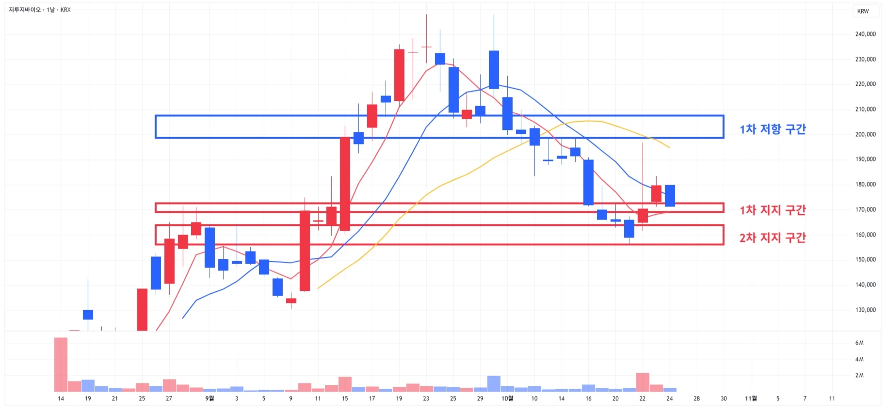 4) 지투지바이오 : 섹터 전반적 약세에 1차 지지 구간 상단 이탈 후 마무리