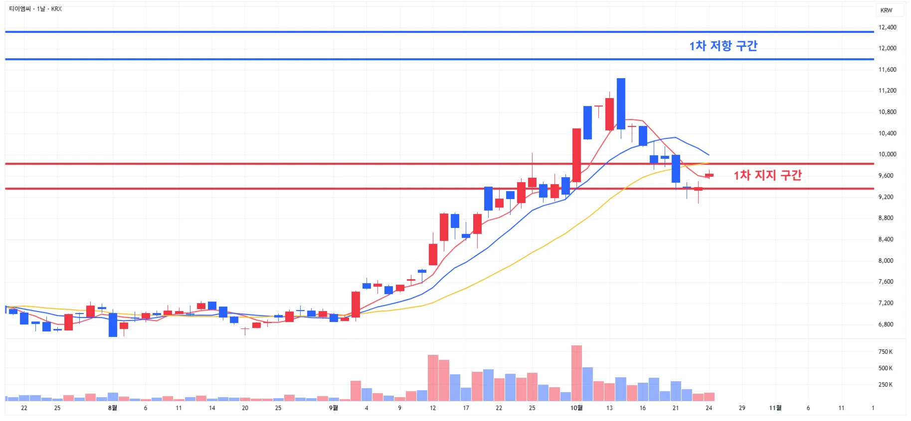 2) 티이엠씨 : 섹터 전반적 상승에 1차 지지 구간에서 반등 진행 후 마무리