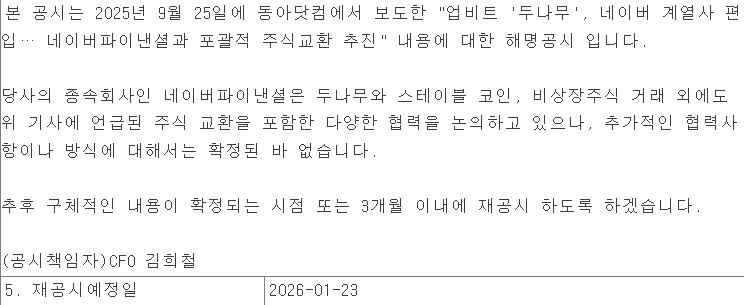 → '네이버와 두나무는 계속 협력을 논의중이고, 아직 결론은 내지 못했다' 정도로 생각해두시면 좋을 것