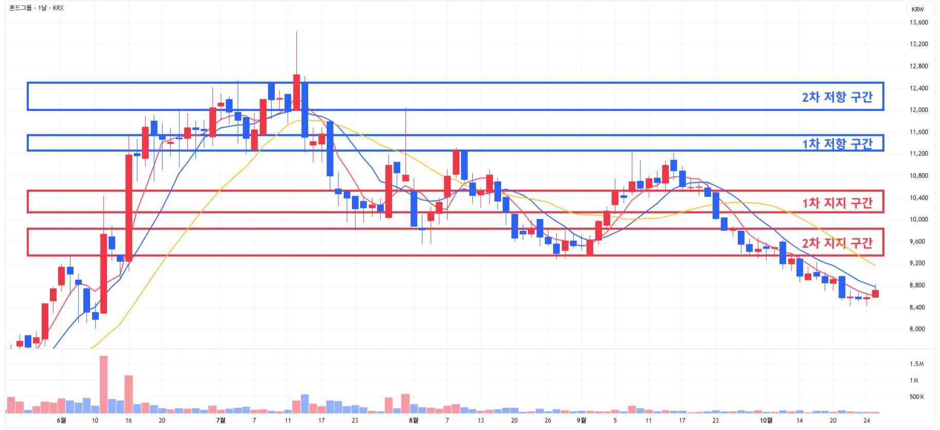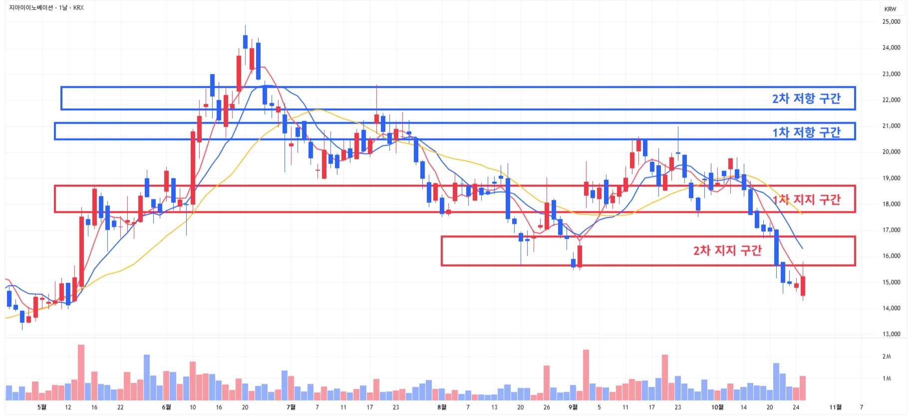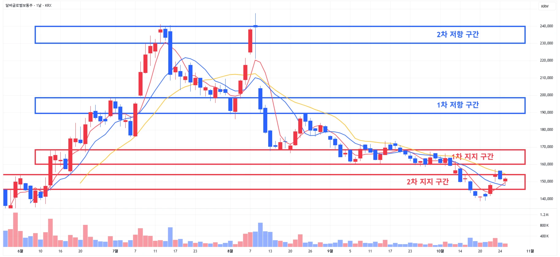 1차 지지 구간 하단 이탈 시에는 일부 물량 손절 후, 2차 지지 구간 도달 시 분할 매수 진행