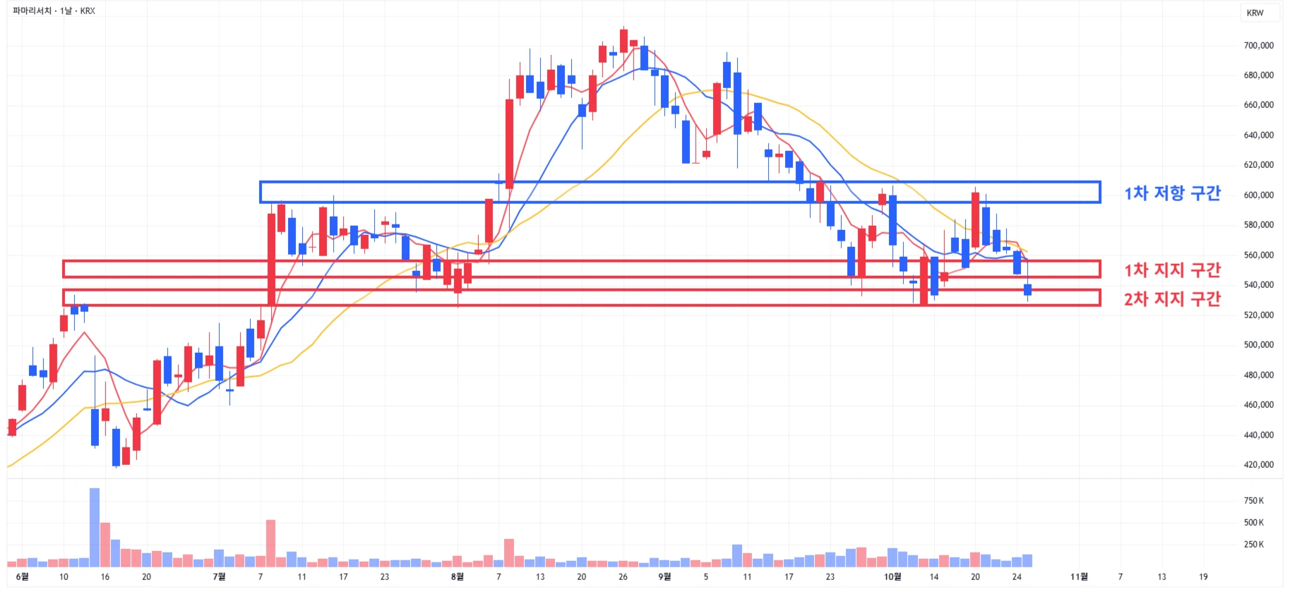 4) 파마리서치 : 당일 시장 소외에 2차 지지 구간 까지 하락하며 마무리