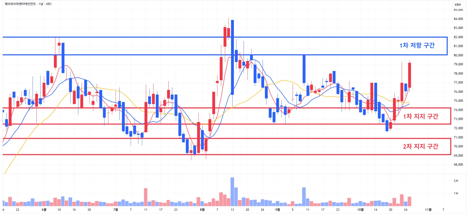 1) JYP : 반등세가 지속 이어지며 1차 저항구간 하단까지 도달하며 마무리