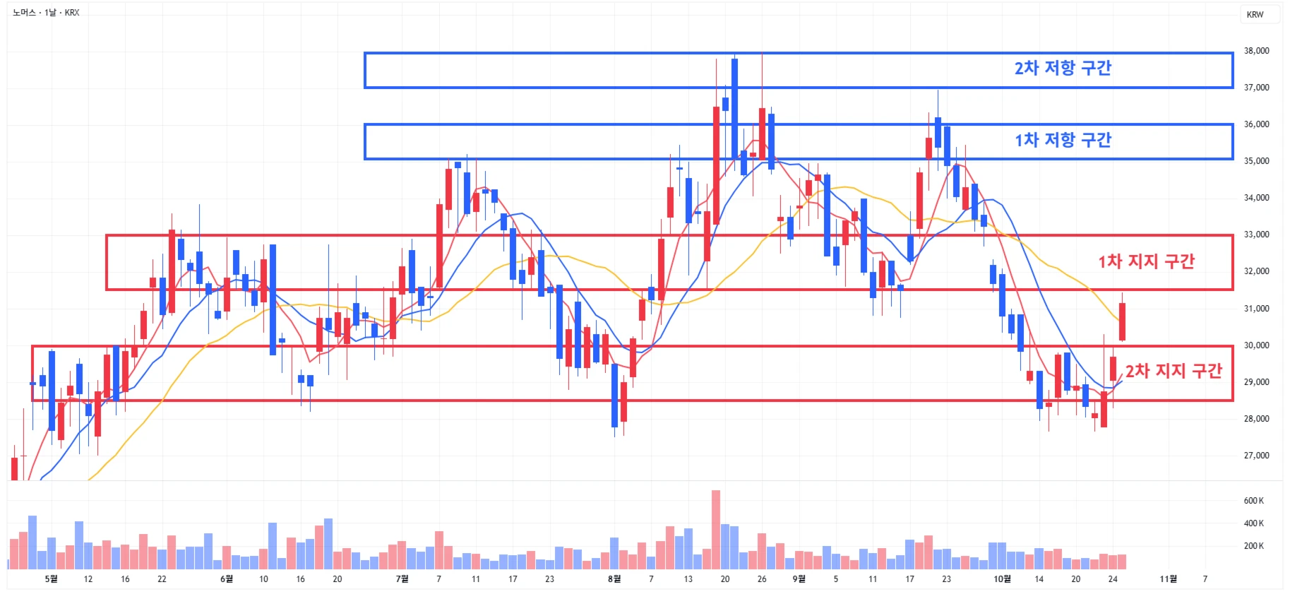2) 노머스 : 당일에도 섹터 전반적 강세에 힘입어, 1차 지지 구간 하단에 도달