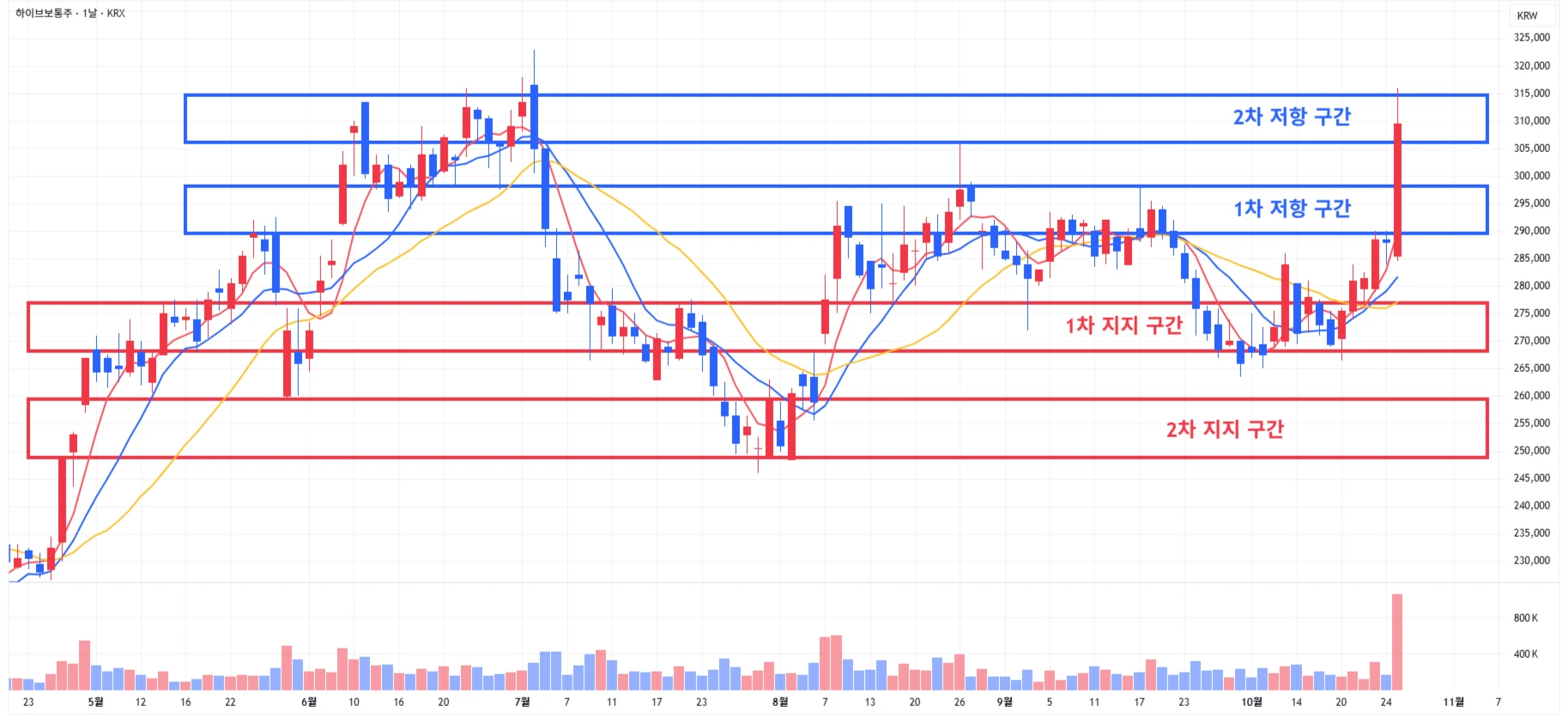 4) 하이브 : 당일 큰 폭의 상승을 보여주며 2차 저항 구간까지 당일 한번에 도달 후 마무리