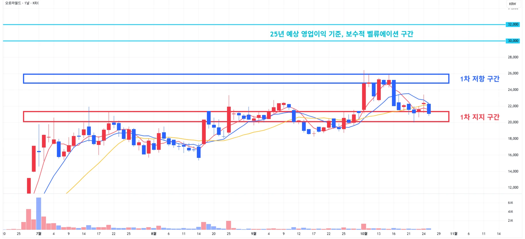 5) 오로라 : 당일 시장 소외에 1차 지지 구간 상단을 이탈하며 마무리