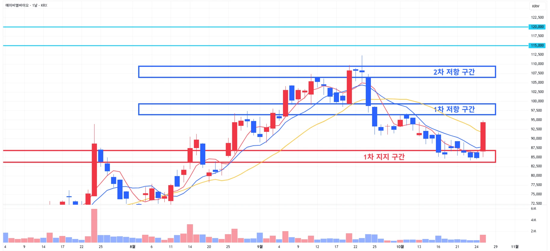 1차 지지 구간에서 강하게 반등하며, 당일 1차 저항 구간 하단 근처에서 마무리