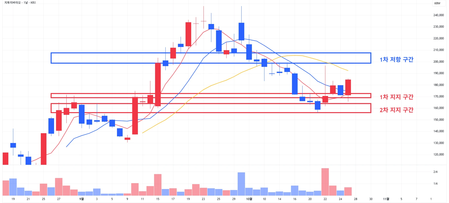 4) 지투지바이오 : 섹터 전반적 강세에, 다시 1차 지지 구간에서 지지 받을후 강한 반등에 성공