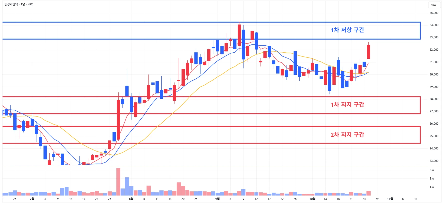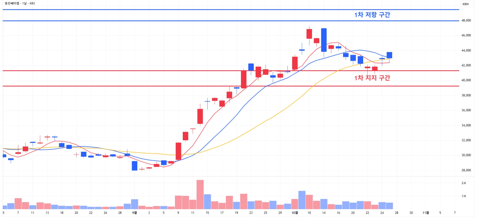 1) 동진쎄미켐 : 1차 지지 구간에서 지지 받은 이후, 반등세가 지속되는 모습