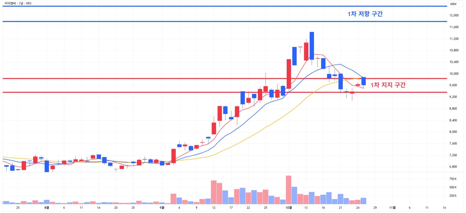 2) 티이엠씨 : 1차 지지 구간 상단 저항에 소폭 하락하며 마무리