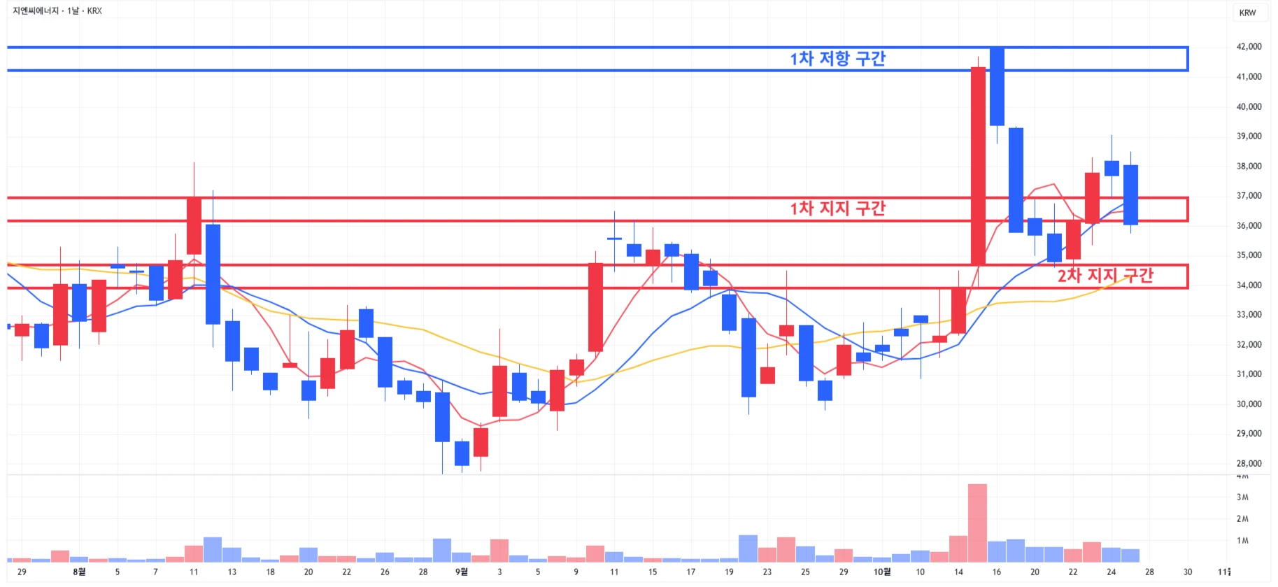 1) 지엔씨에너지 : 당일 기관/외국인 양대모에 1차 지지 구간 소폭 이탈 후 마무리