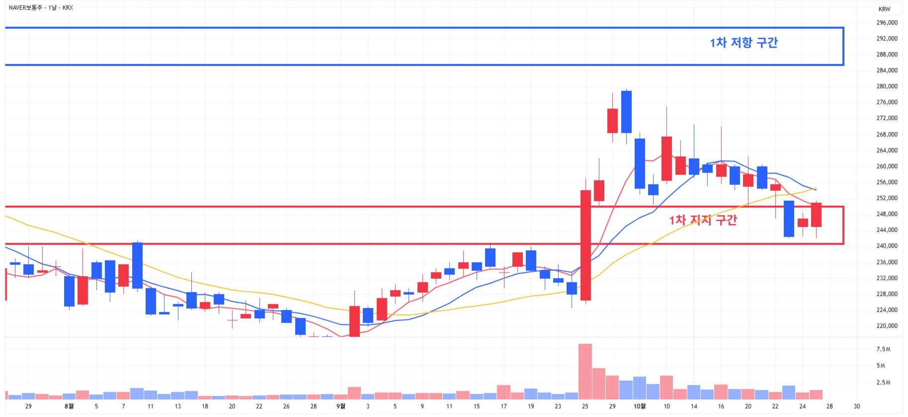 1) 네이버 : 합병 공시 연기로 인한 하락 일부분을 되돌리며, 1차 지지 구간 상당 위에서 마무