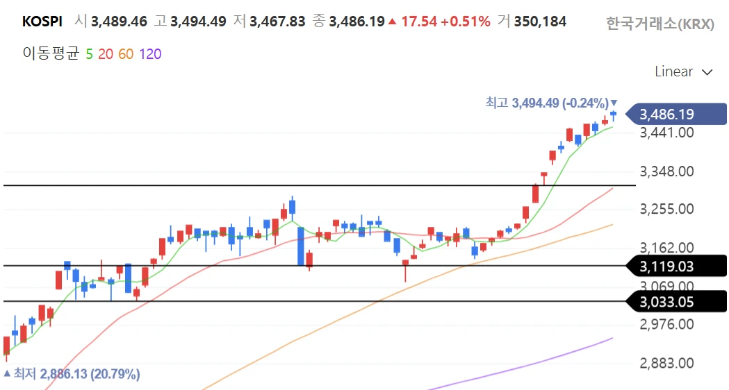 코스피는 3500선을 앞두고 있는 상황으로 견조한 상승 흐름을 유지하는 모습