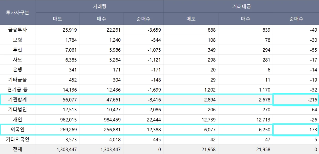 금일 기관은 약 2,200억 가량 순매도 하였고, 외국인은 약 1,700억원 정도 순매수 진행