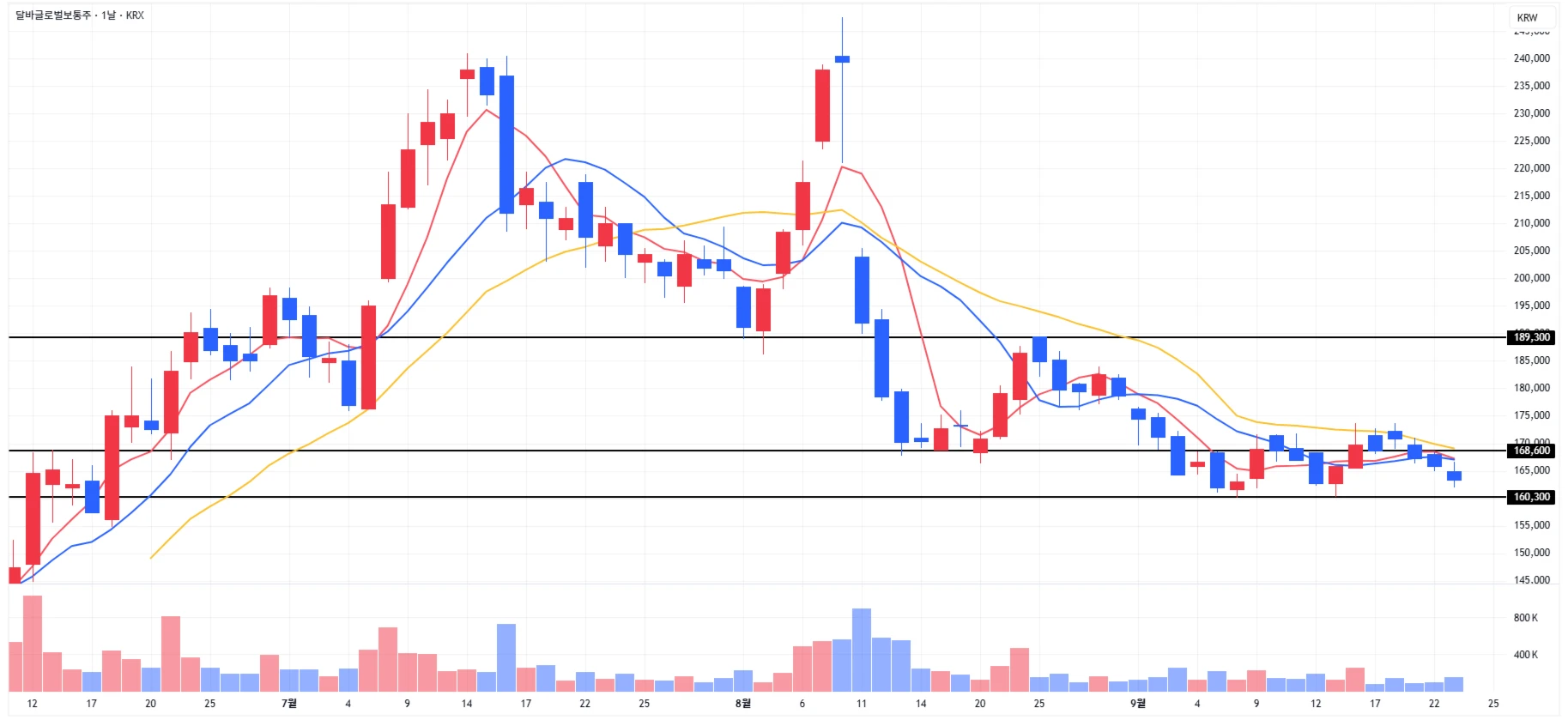 1) 달바글로벌 : 섹터 약세에 당일 소폭 하락하며 1차 지지 구간 안에서 마무리