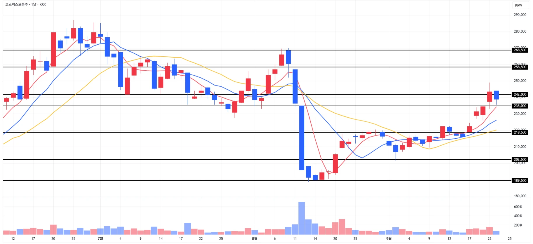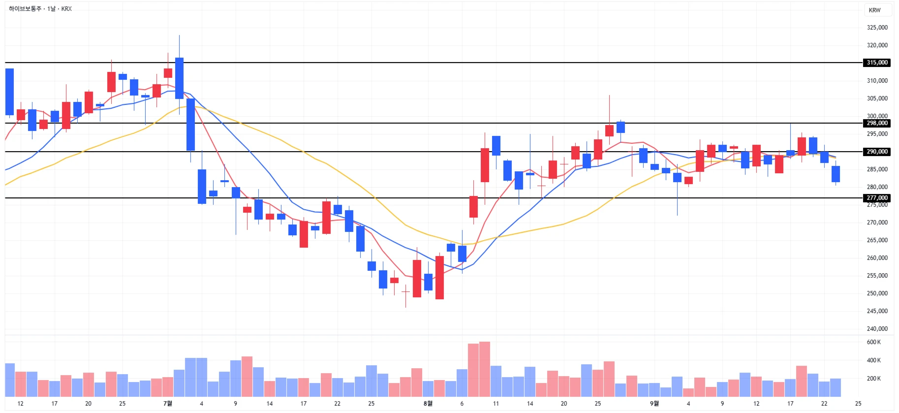 4) 하이브 : 당일에도 하락이 이어지며 1차 지지 라인 하단 근처에서 마무리