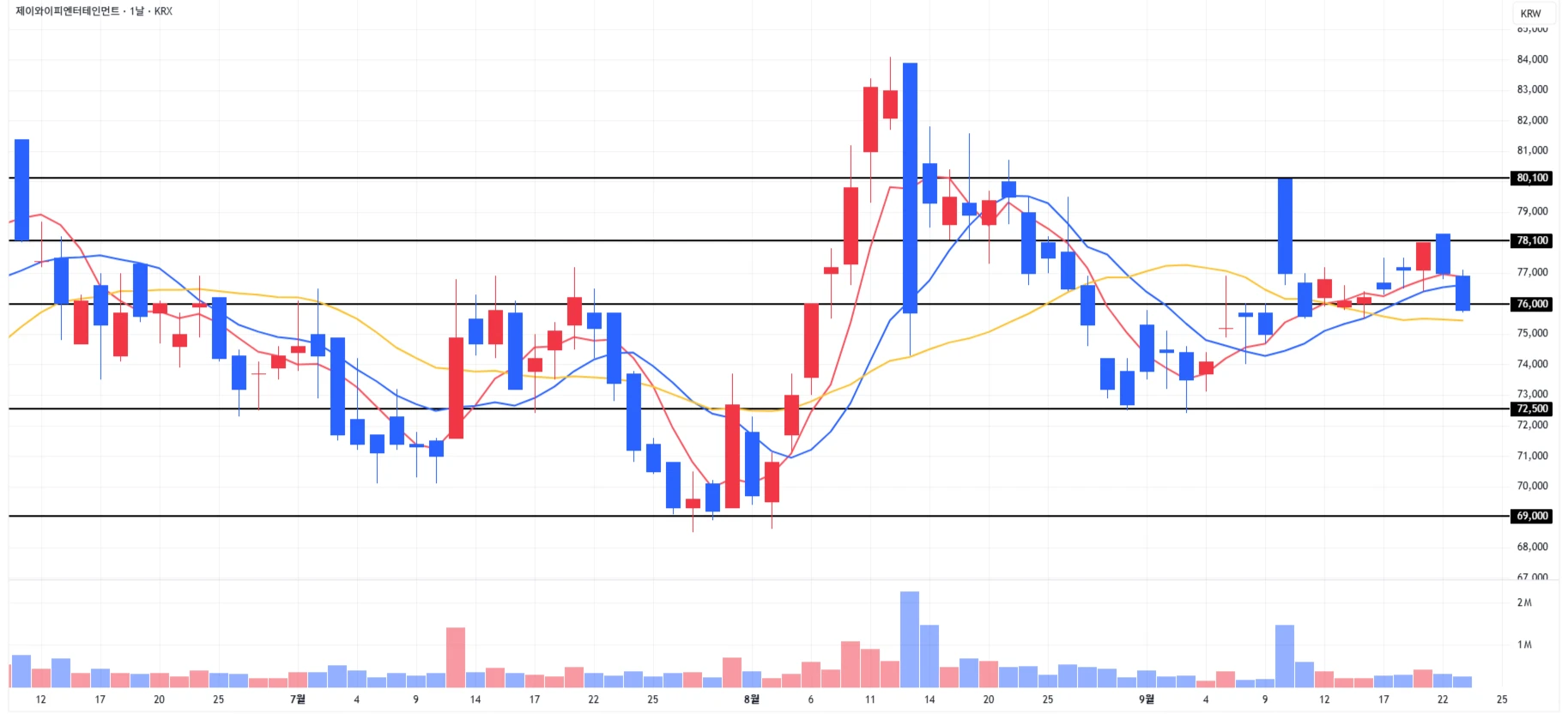 1) JYP : 어제에 이어 오늘도 하락이 이어지며 다시 1차 지지구간 아래에서 마무리