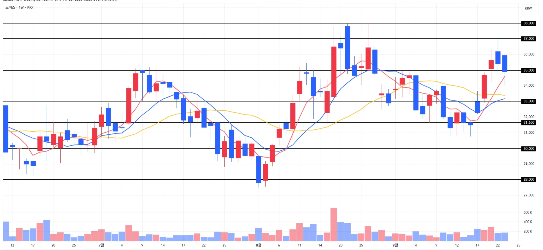 2) 노머스 : 섹터 전반적인 약세에 하락하였으나, 장중 일부 회복하여 1차 저항 구간 근처 마무리
