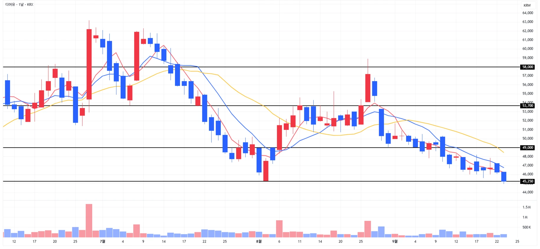 3) 디어유 : 하락세가 지속되는 상황으로, 당일에는 이전 저점 구간까지 하락하며 마무리