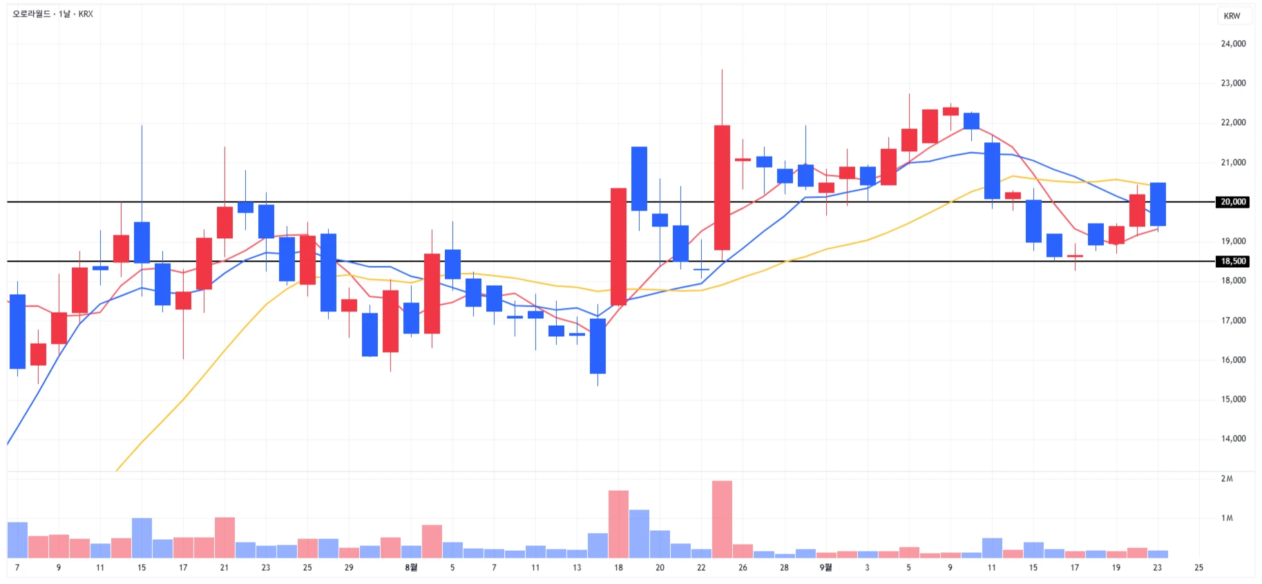 전일 반등이 이어지며, 주요 저항 구간인 2만원 위로 상승했지만, 당일 재하락하며 이탈 후 마무리
