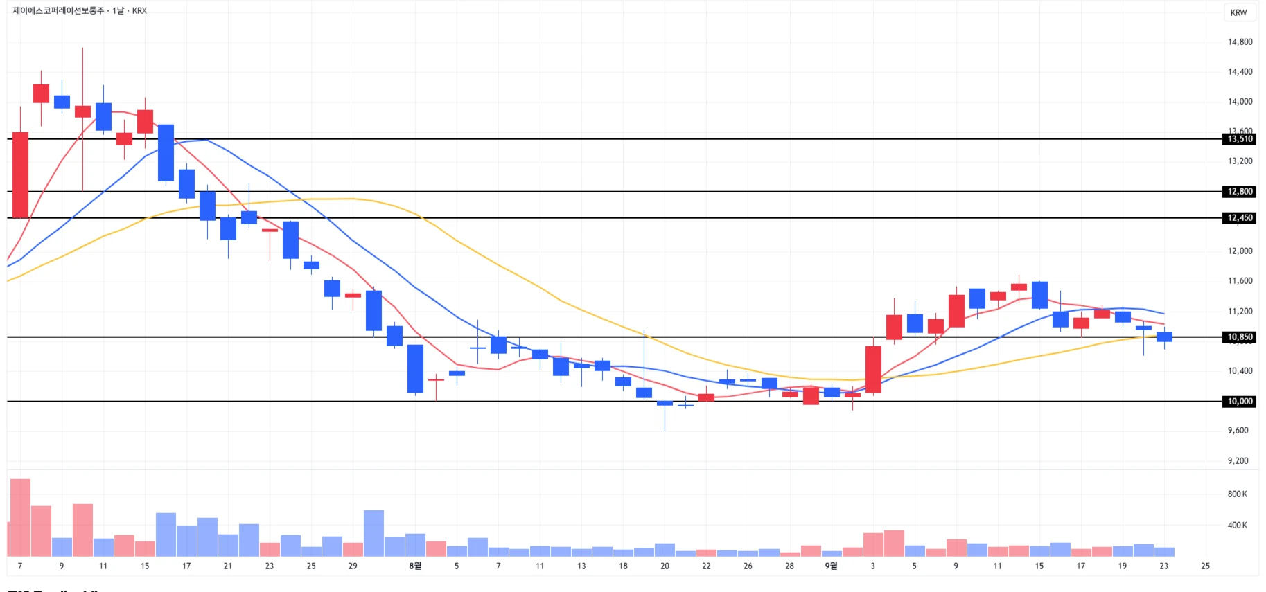 1) 제이에스코퍼레이션 : 당일 하락이 이어지며 1차 지지구간 소폭 이탈 후 마무리
