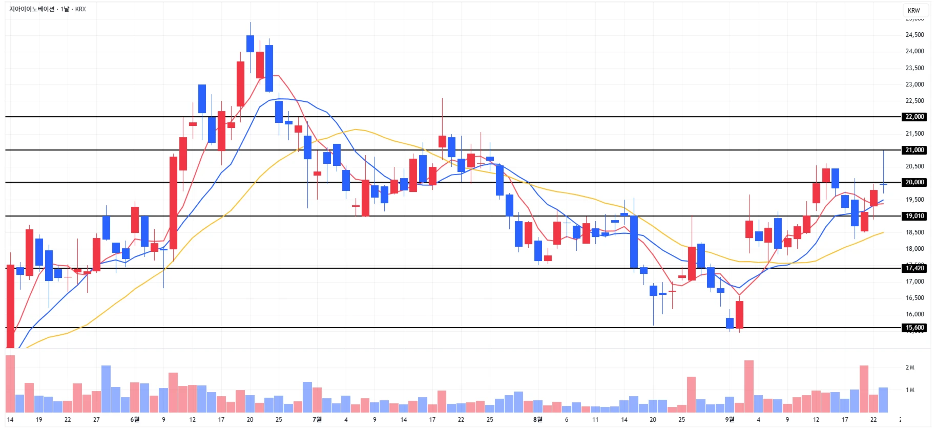 2) 지아이이노베이션 : 당일 장중 5%가 넘게 상승하며 2차 저항 구간 하단까지 도달했으나,