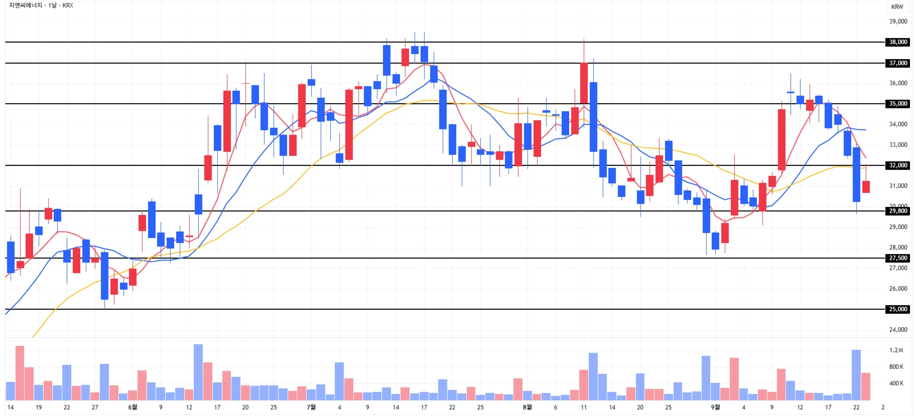 1) 지엔씨에너지 : 전일 과매도 상황에, 당일에는 전일 하락분 일부 회복하며 마무리