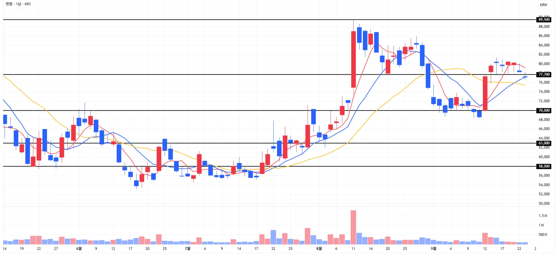 4) 엔켐(전해액) : 당일에도 하락이 발생하며 1차 지지 구간 소폭 이탈 후 마무리
