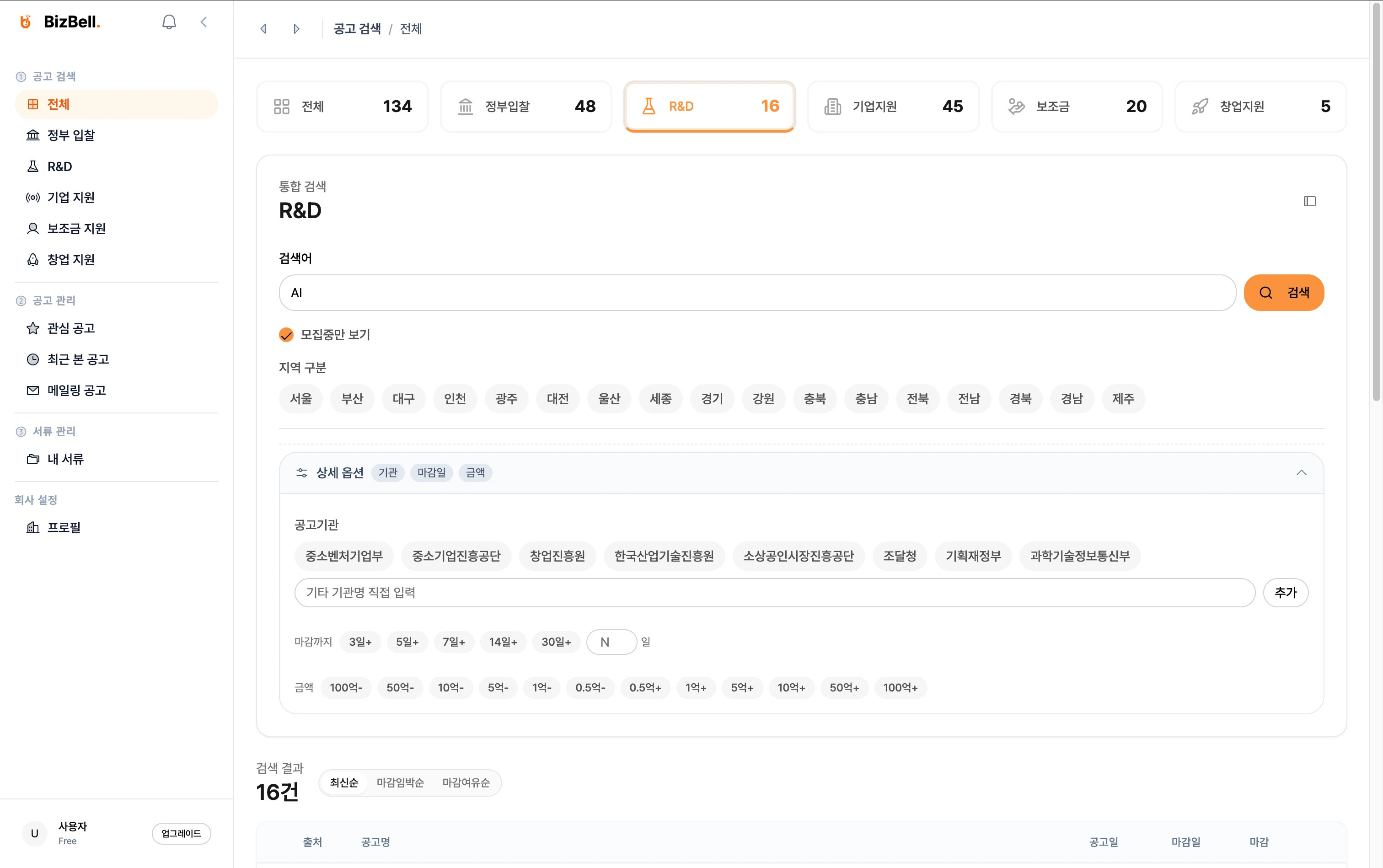 공고 검색 - R&D