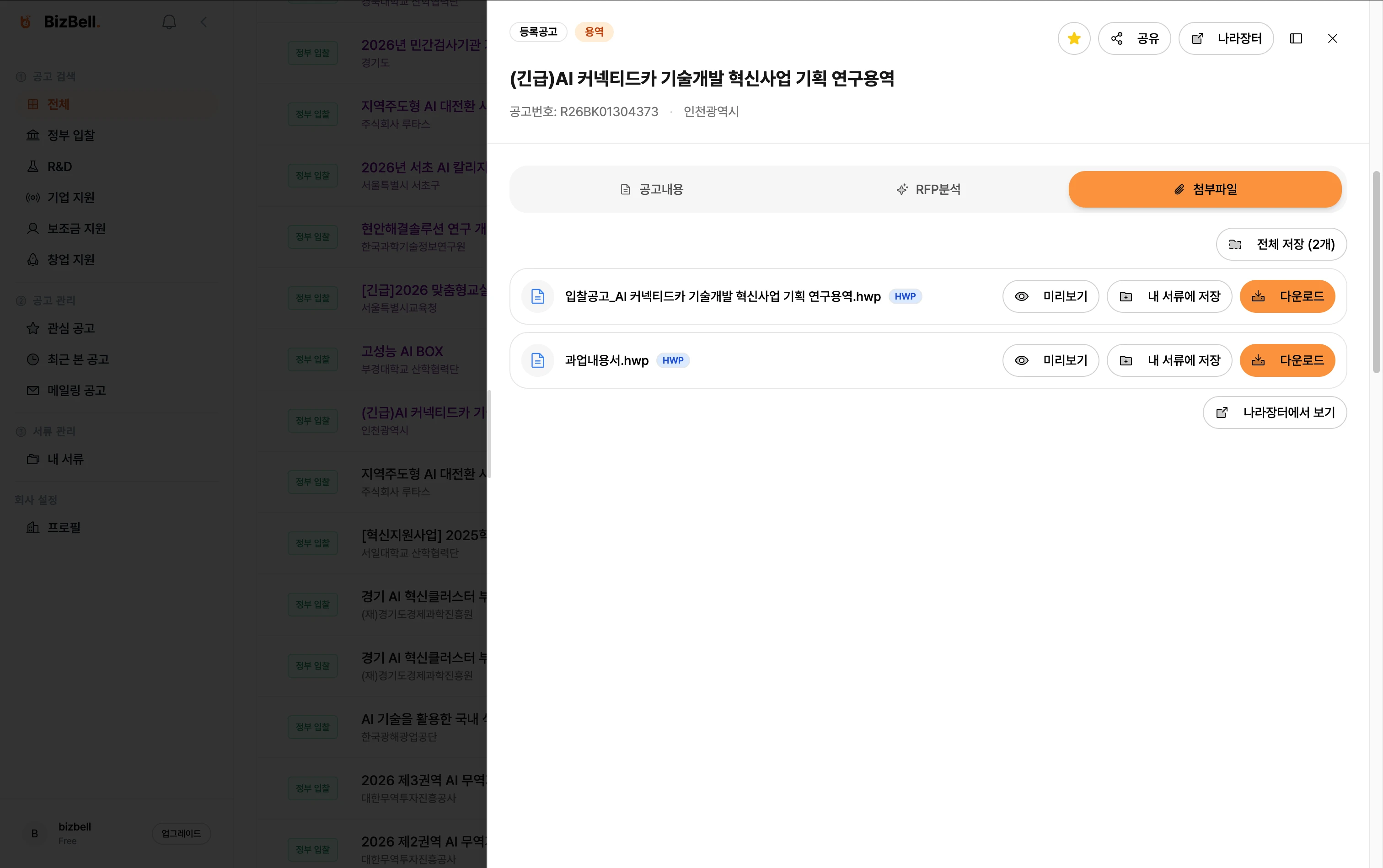 비즈벨 - 중소기업·스타트업을 위한 정부지원사업 통합 검색. 나라장터, 기업마당, K-Startup 공고를 한 번에 검색하고, RFP 요구사항 자동 분석과 맞춤 알림으로 사업 기회를 놓치지 마세요.