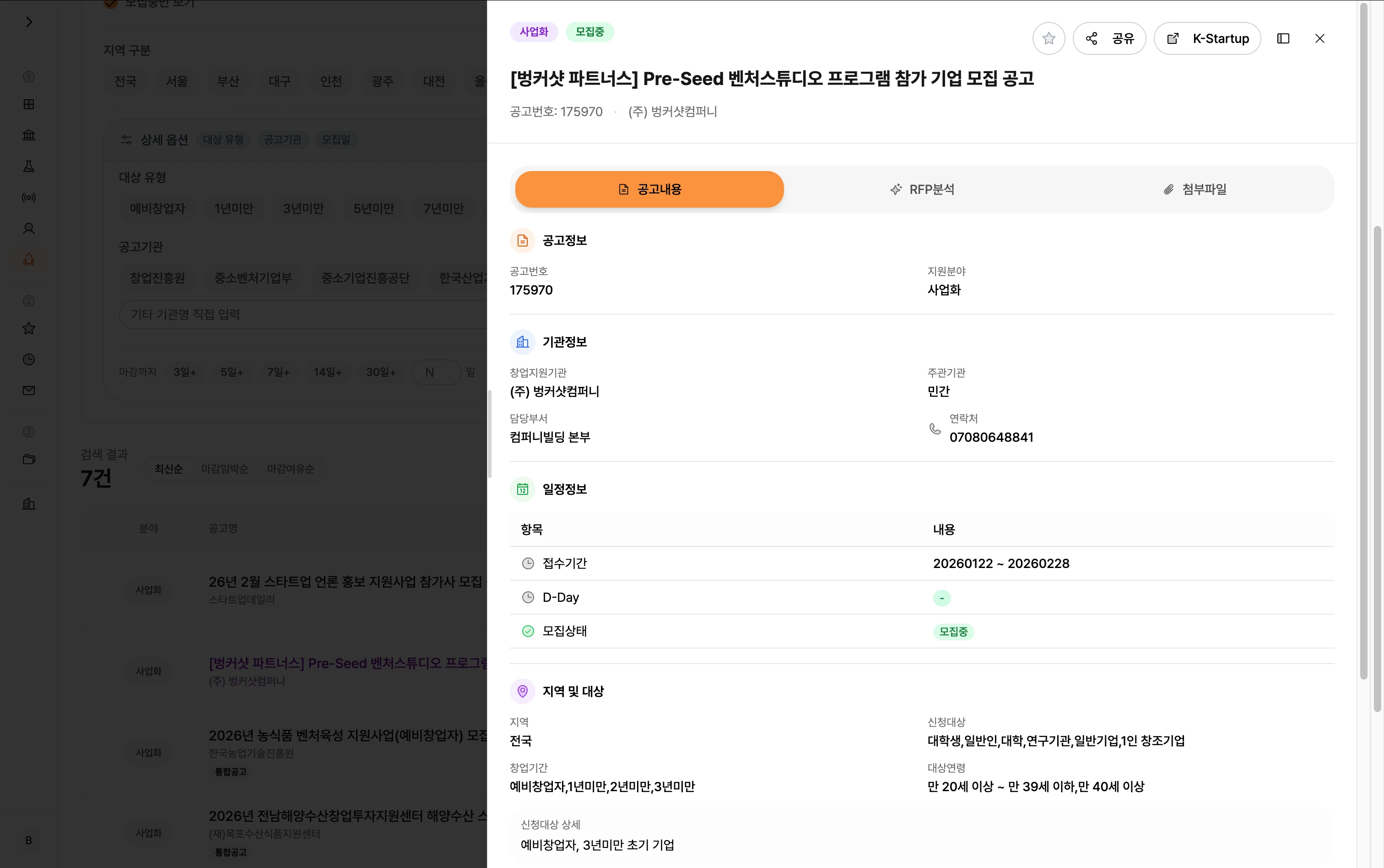 비즈벨 - 중소기업·스타트업을 위한 정부지원사업 통합 검색. 나라장터, 기업마당, K-Startup 공고를 한 번에 검색하고, RFP 요구사항 자동 분석과 맞춤 알림으로 사업 기회를 놓치지 마세요.