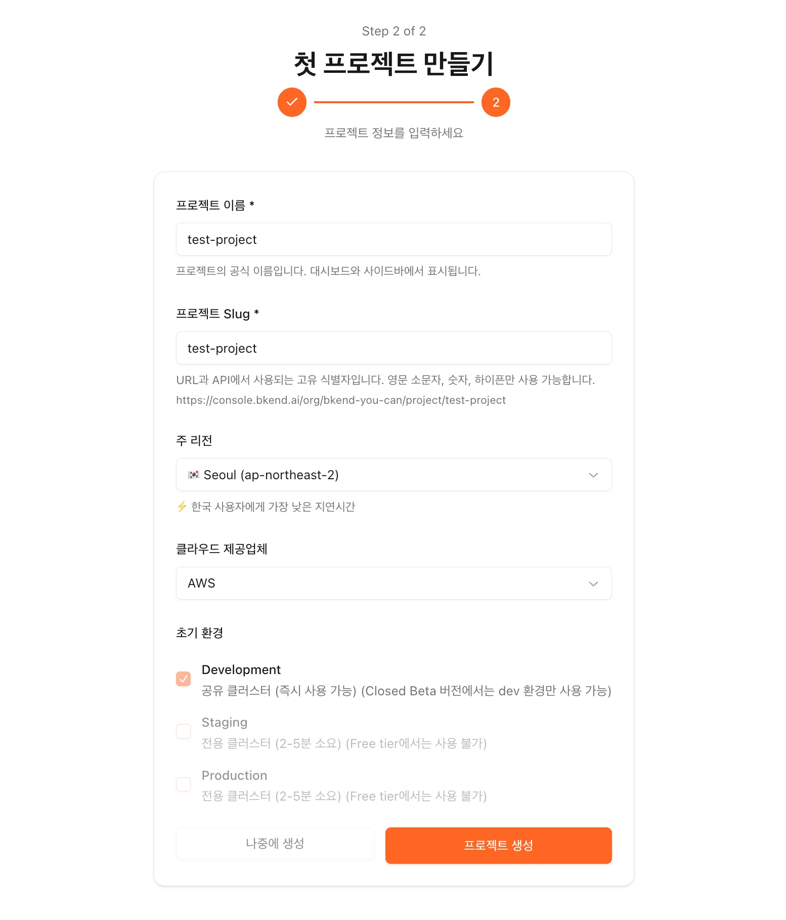 서버 구축 → 데이터베이스 설치 → API 개발 → 배포 설정 (며칠~몇 주)