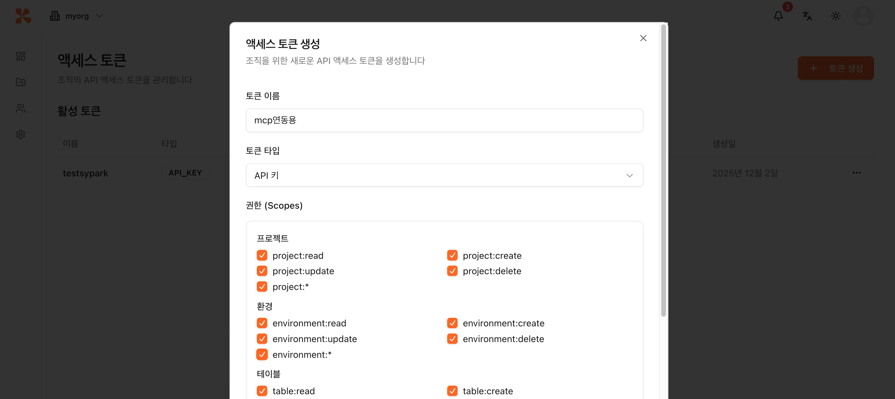 "테이블 생성" 버튼 클릭 → 폼 작성 | "Todo 테이블 만들어줘" |