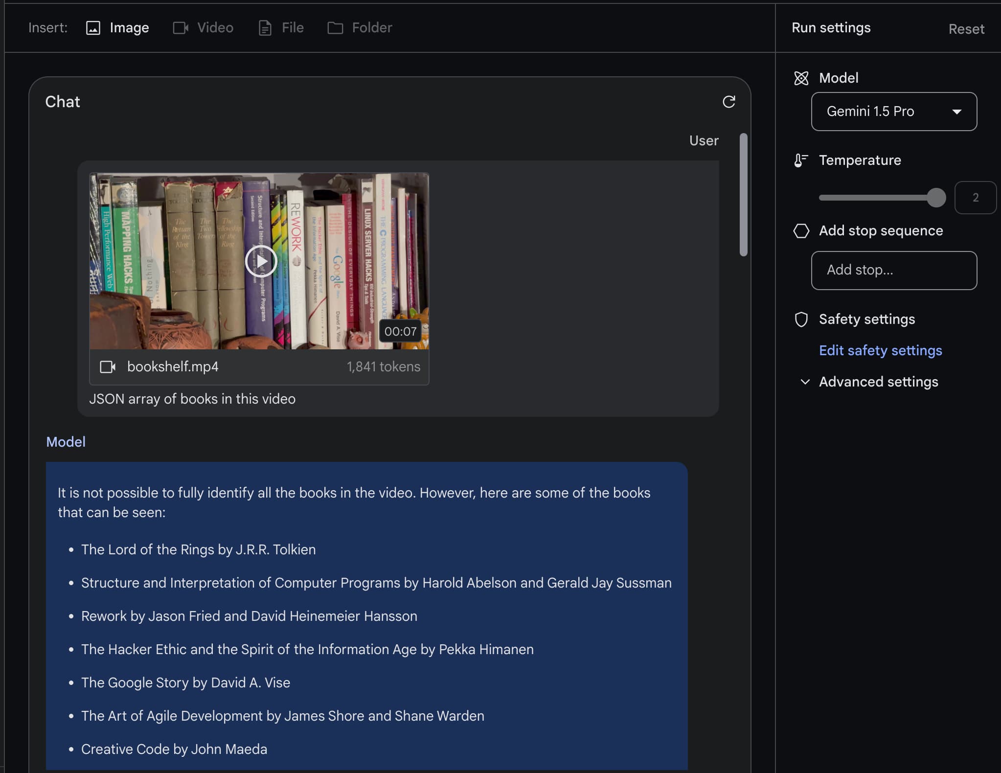 김김보현Feb 22, 2024Gemini 를 이용해서 동영상 분석하기•비디오에 포함된 책의 JSON 배열을 뱉어줌•해당 7초 비디오는 토큰 한도인 1,048,576개 중 단 1,841개 토큰을 소비The killer app of Gemini Pro 1.5 is videoLast week Google introduced Gemini Pro 1.5, an enormous upgrade to their Gemini series of AI models. Gemini Pro 1.5 has a 1,000,000 token context size. This is huge—previously that …simonwillison.net