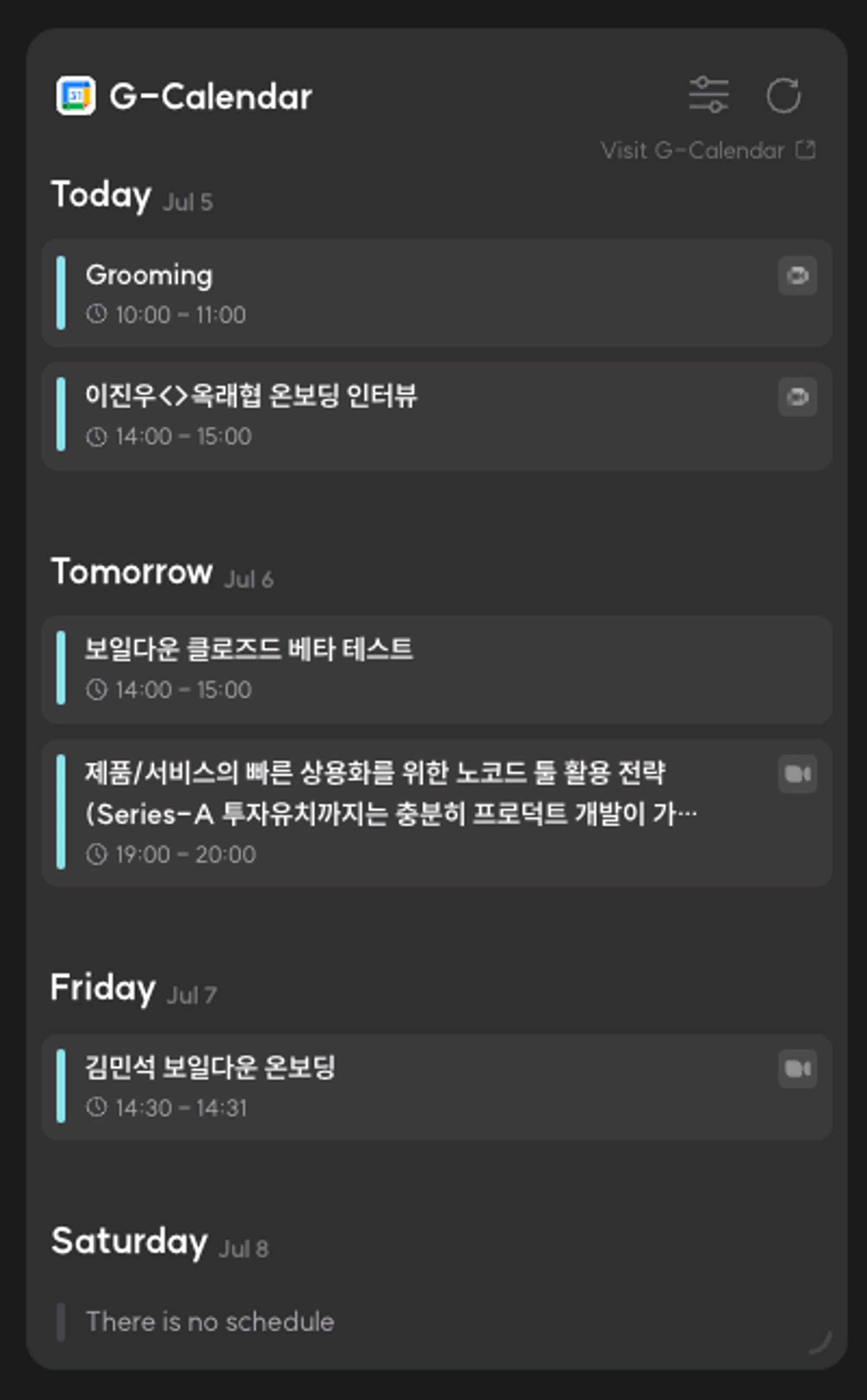 4️⃣ Google Meet 나 Zoom 미팅이 추가되어 있는 일정의 경우 우측의 미팅 참석 아이콘이 활성화됩니다. 해당 아이콘을 통해 화상 미팅을 바로 참석할 수 있습니다.