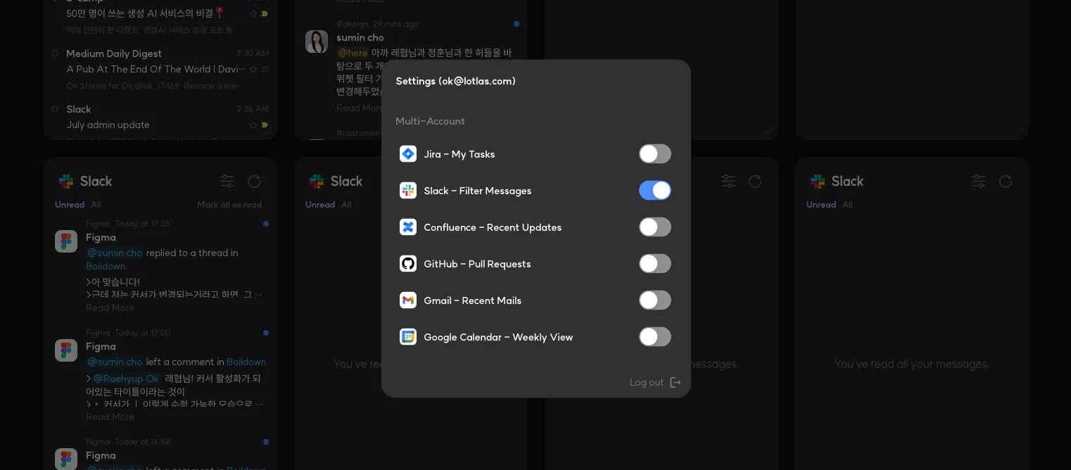 이런 분들에게 추천드려요! 슬랙에서 여러 워크 스페이스의 메시지를 모두 확인해야 하는 분! Gmail을 여러 계정으로 활용하고 있는 분! 프리랜서로 여러 프로젝트에 동시 참여하고 있는 분! 여러 계정을 연동하여 한눈에 파악하기 각 위젯 별 Multi-Account 설정을 활성화 해주세요! 1️⃣ 우측 상단 프로필 이미지를 눌러주세요. 2️⃣ 여러 계정을 등록고자 하는 위젯의 Multi-Account 토글을 활성화 해주세요. Slack 위젯을 활용하여 여러 워크스페이스의 메시지를 모아보세요! 1️⃣ 연동할 워크스페이스의 수만큼 위젯을 추가해주세요. 2️⃣ 연동을 희망하는 워크스페이의 각각 연결해주세요. Gmail 위젯을 활용하여 여러 계정의 메일을 모아보세요! 1️⃣ 계정 수 만큼 위젯을 추가하여 연동해주세요. 경고 화면이 나온다면, Google에서 확인되지 않은 앱 경고 다음 페이지 안내를 따라주세요.