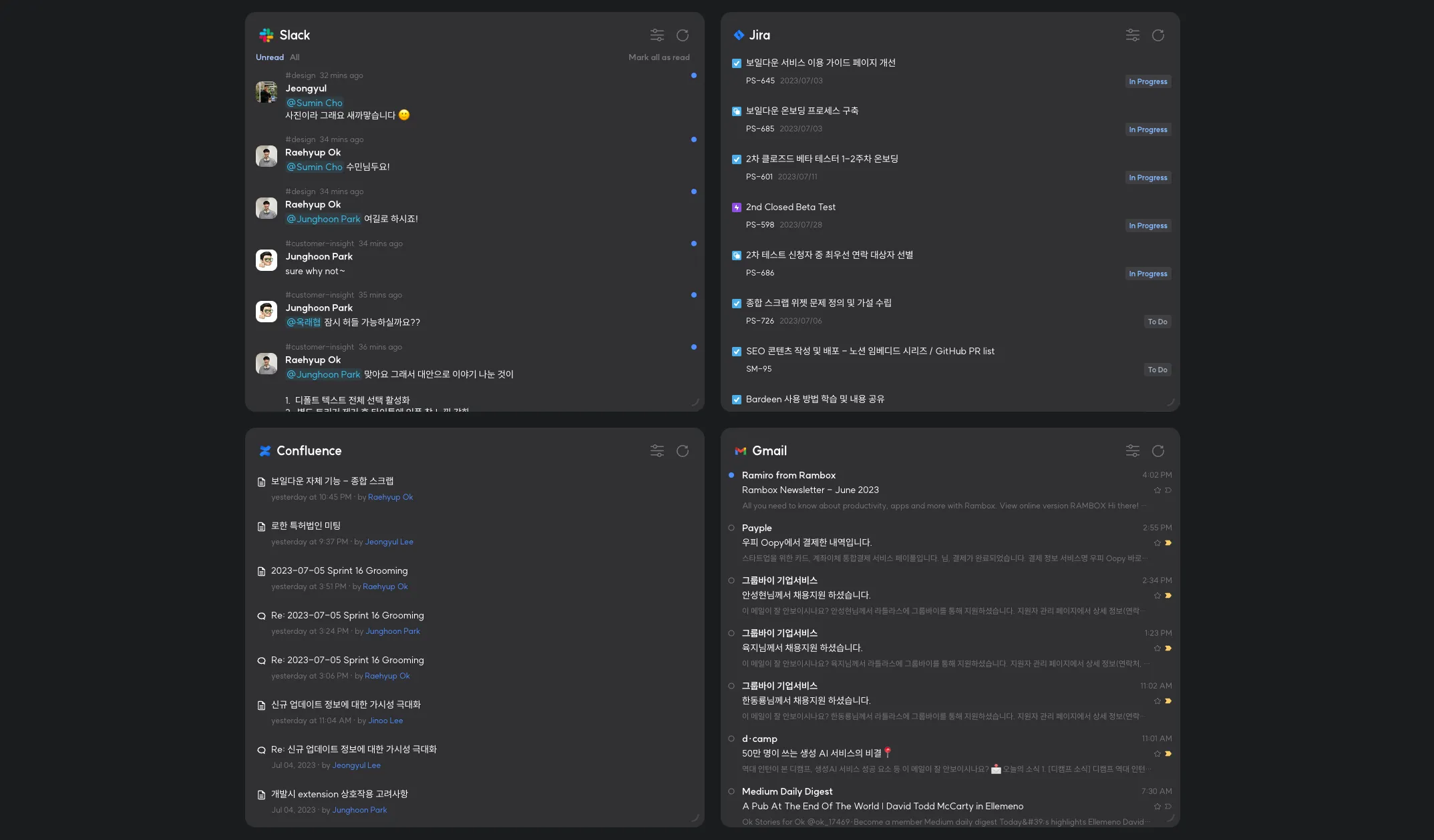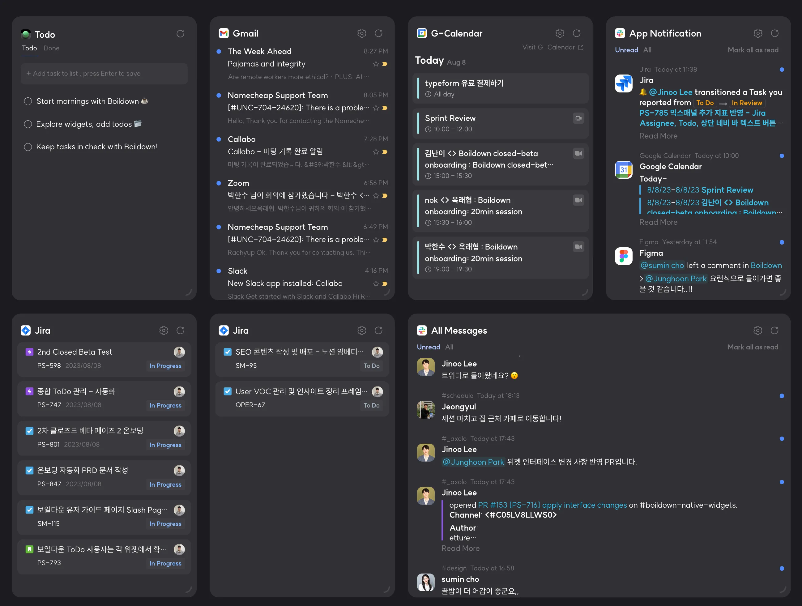 이런 분들에게 추천드려요! 프로젝트 협업 툴 뿐만 아니라 다양한 채널의 정보를 종합적으로 파악 후 하루 업무 계획을 세우는 분! 지라에서 내가 담당받은 업무를 한눈에 파악하고 싶은 분! 매일 아침 주기적으로 방문하던 수많은 탭을 한 탭에서 확인하고 싶은 분! 보일다운과 함께 아침 업무 시작하기 JIRA 위젯을 활용하여 내가 담당받은 업무를 한눈에 확인해 보세요! 1️⃣ 지라 위젯을 추가하여 원하는 프로젝트와 상태를 설정해 주세요. 2️⃣ 확실하게 상태별로 구분하여 관리하고 싶다면 지라 위젯을 추가하여 상태를 다르게 설정해 주세요. Slack 위젯을 통해 주요 채널의 업무 맥락을 파악해 보세요! 1️⃣ Slack 위젯을 추가하여, 내가 확인해야 하는 주요 채널, 혹은 주요 팀원들만 필터에 적용해 보세요! 2️⃣ 채널 관계 없이 시간순으로 주요 메시지를 확인해보세요! 팀의 업무 맥락을 한눈에 파악할 수 있습니다.