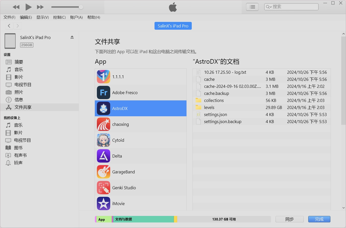 最后将该adx文件拖进iTunes中"'AstroDX'的文档“下方