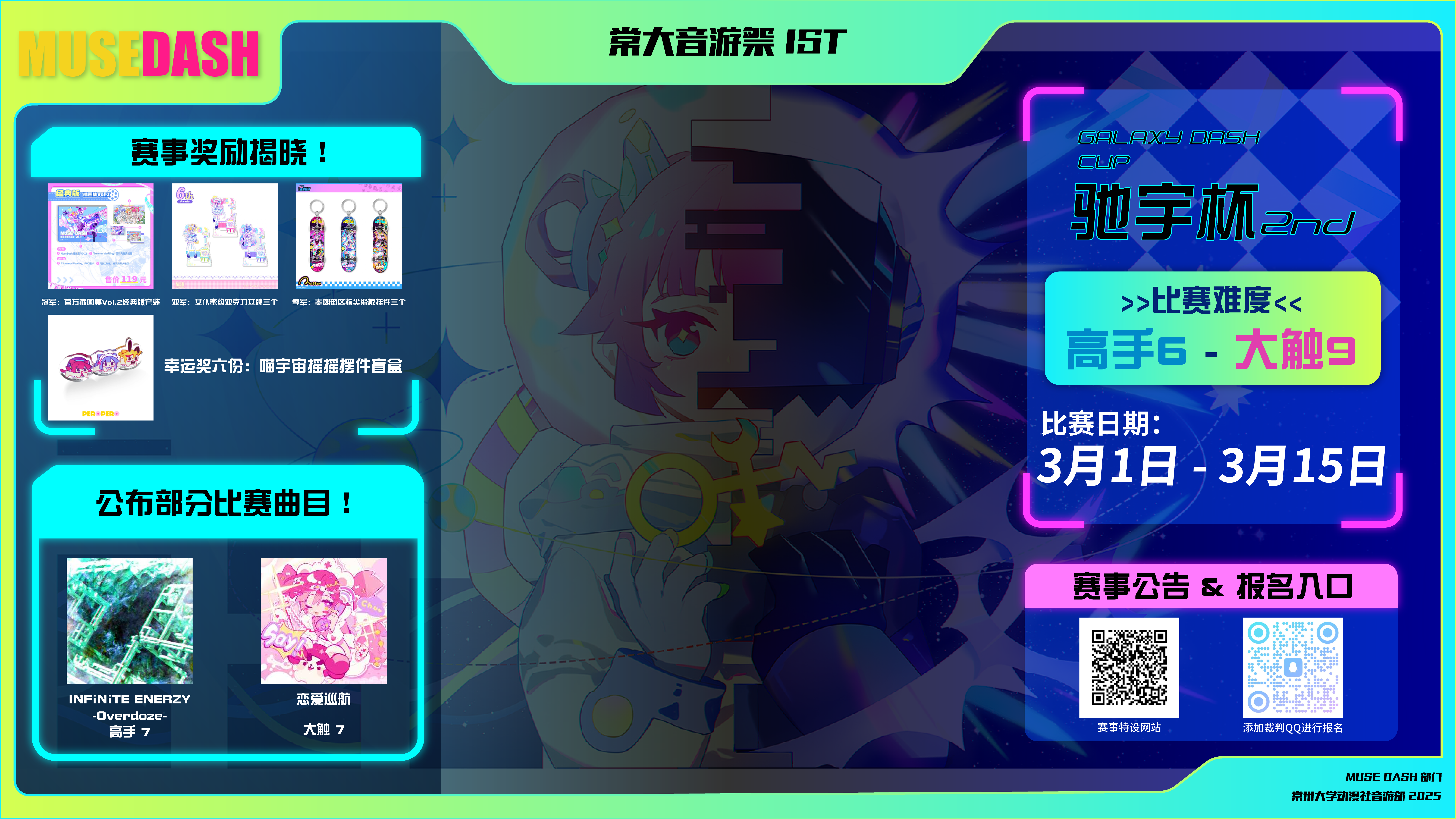 一、参赛条件 1.需为常州大学学生 2.需在华立科技代理运营的《舞萌DX》上比赛 二、比赛规则 1.作弊禁止,重复报名禁止 2.本比赛全程线下,共分有三个赛区 高手赛区:Rating 0至14999 大师赛区:Rating 15000及以上 娱乐赛区:选手可自由选择是否参加 高手/大师赛区不可多选,可多选娱乐赛区 3.每个赛区共有四轮比赛,每轮比赛有三首固定曲目 前三轮曲目将被公开,且不会淘汰选手 根据选手三轮共九首歌的准度总和选出最高的四人晋级第四轮 4.每轮比赛仅开放一周,选手需在一周内完成该轮的三首歌 三首歌必须在1pc内连开,否则成绩无效 考虑到舞萌拼机的情况,建议选手互相拼机,第一首可用于热身 5.选手向裁判提交截图需包含时间特征和成绩 在公众号内查看成绩时,每首歌上方会自带时间,勿遮挡即可 选手可反复提交截图,记三首歌最高总和准度 6.娱乐赛区需要将视频素材提供给裁判,越有趣得分越高 不限人数,不限准度,不限手法,勿破坏机台和影响他人即可