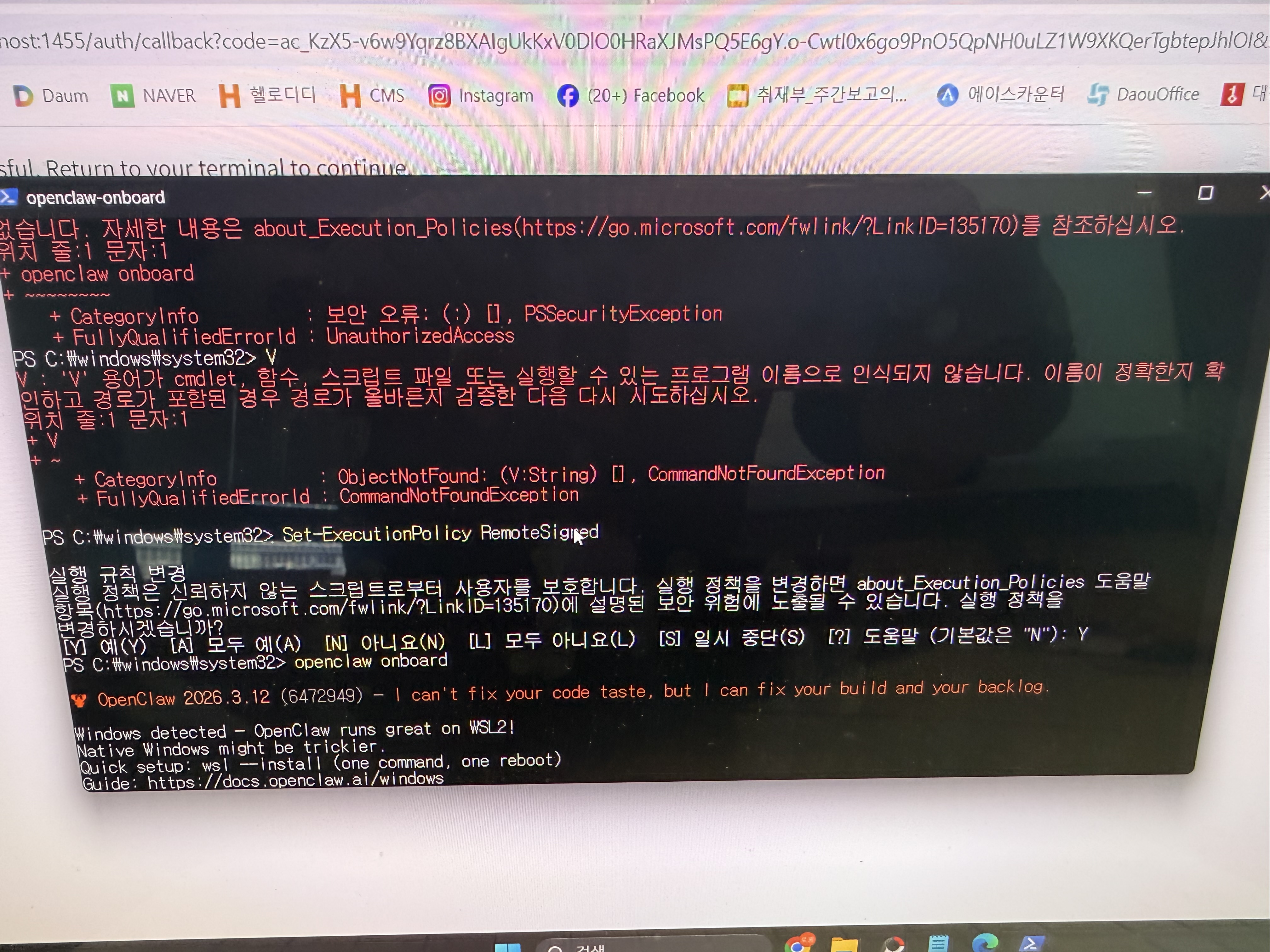 설치 이후 wsl을 종료했지만 여전히 openclaw가 명령어로 먹지 않는 경우(이 시스템에서 ~파일을 로드할수 없습니다. 등등)