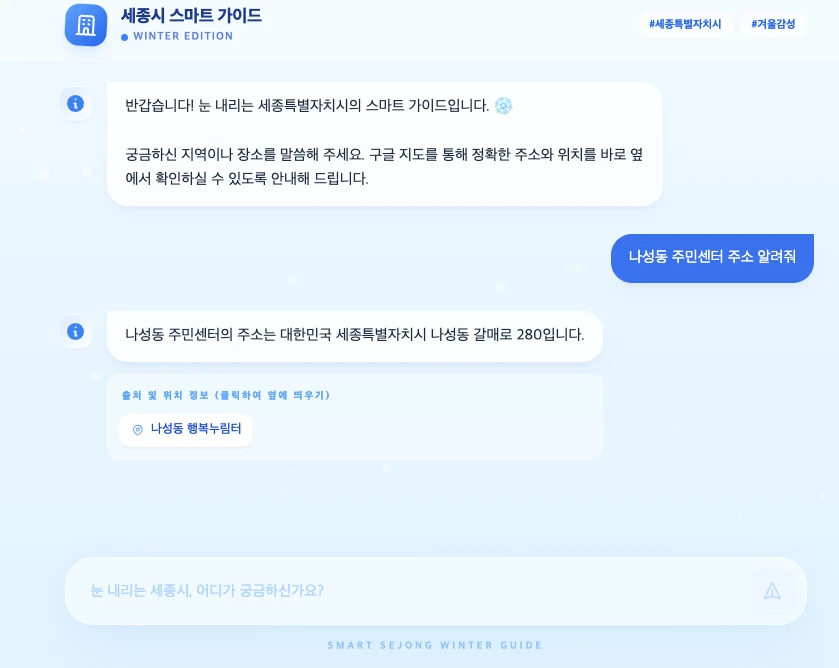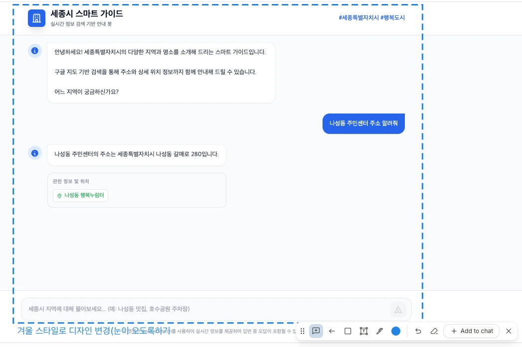 세종시 여러지역을 소개하는 챗봇을 만들어줘. 그라운딩 기능을 사용해서 출처를 밝히고 링크도 함께 제공해줘