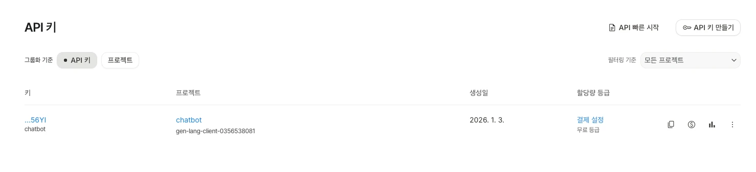 → 프로젝트 이름 지정(chatbot) → 키 이름 지정(chatbot)