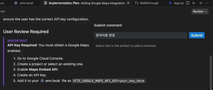 구글 지도를 띄우기 위해 어떻게 해야하냐고 요청 → plan문서를 만들어줌 →