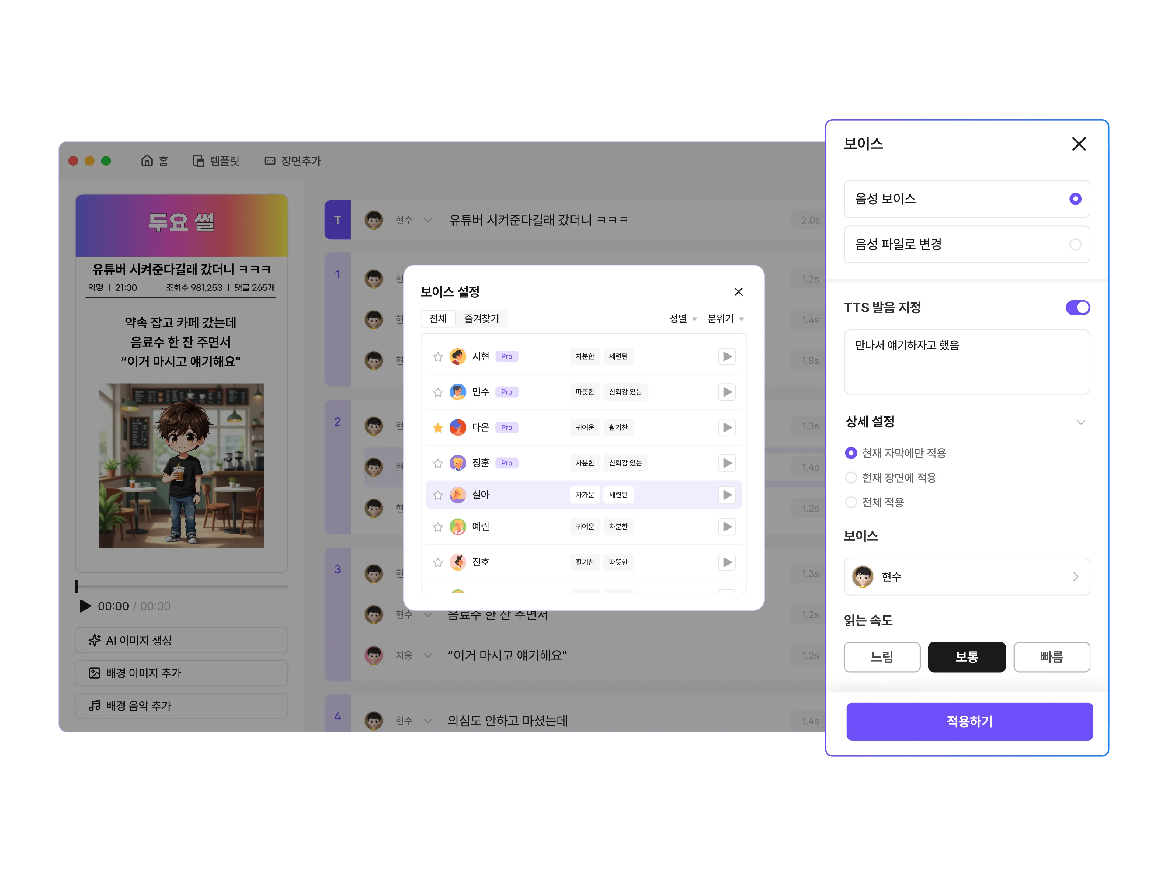 각 음성마다 원하는 AI 보이스를 설정할 수 있어요! 이렇게 사용해 보세요 방법 1: 빠르게 보이스 변경하기 보이스를 변경하고 싶은 문장 좌측 AI 캐릭터를 선택해주세요. 원하는 보이스로 변경하면 끝! 방법 2: 세부 설정으로 보이스 커스터마이징하기 보이스를 변경하고 싶은 문장을 클릭해주세요. 보이스, 읽는 속도, 음정 등 상세 설정을 진행해주세요. ✅ 각 AI 보이스를 직접 들어볼 수 있어요!
