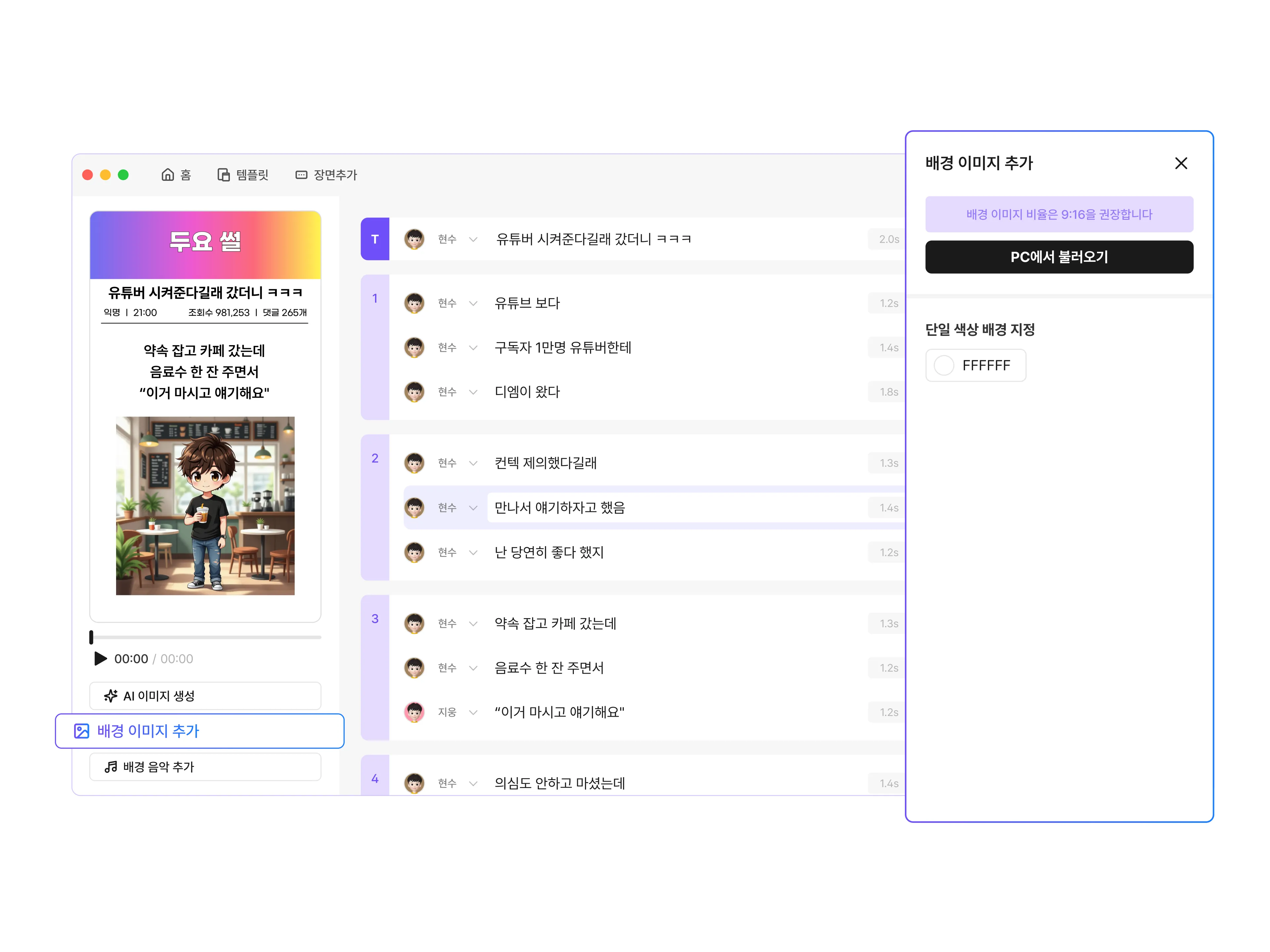 배경 이미지를 에디터 뷰에서 변경 또는 추가할 수 있어요! 이렇게 사용해 보세요 배경 이미지 추가 → PC에서 불러오기 버튼을 클릭해주세요. 배경 이미지로 사용하고 싶은 사진을 선택해주세요. 사용 전 확인하세요 ✅ 배경 이미지는 사용하는 PC에 저장되어 있어야 합니다!