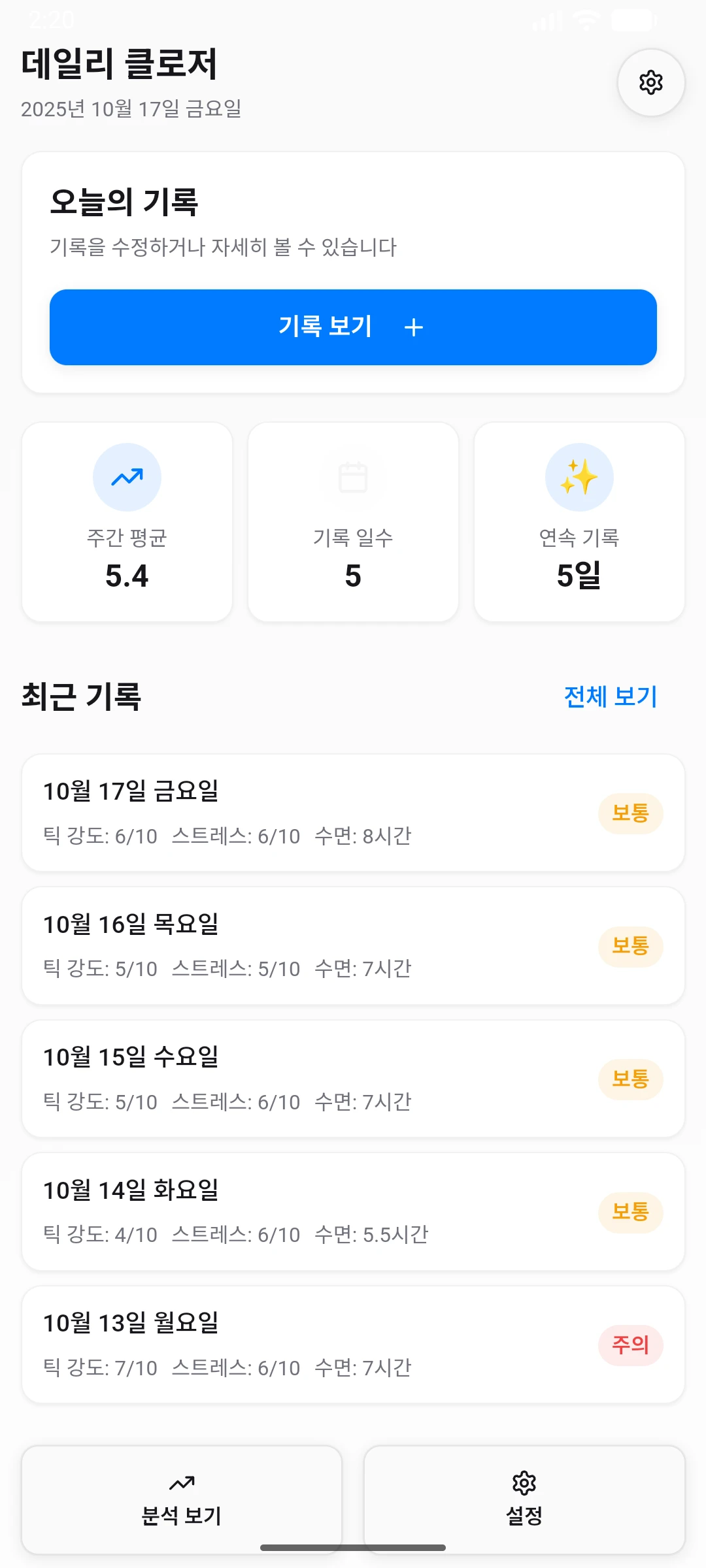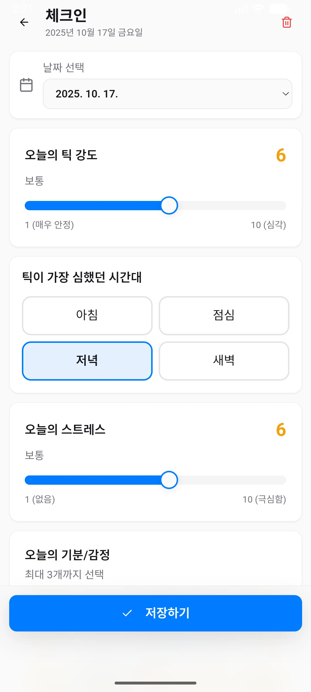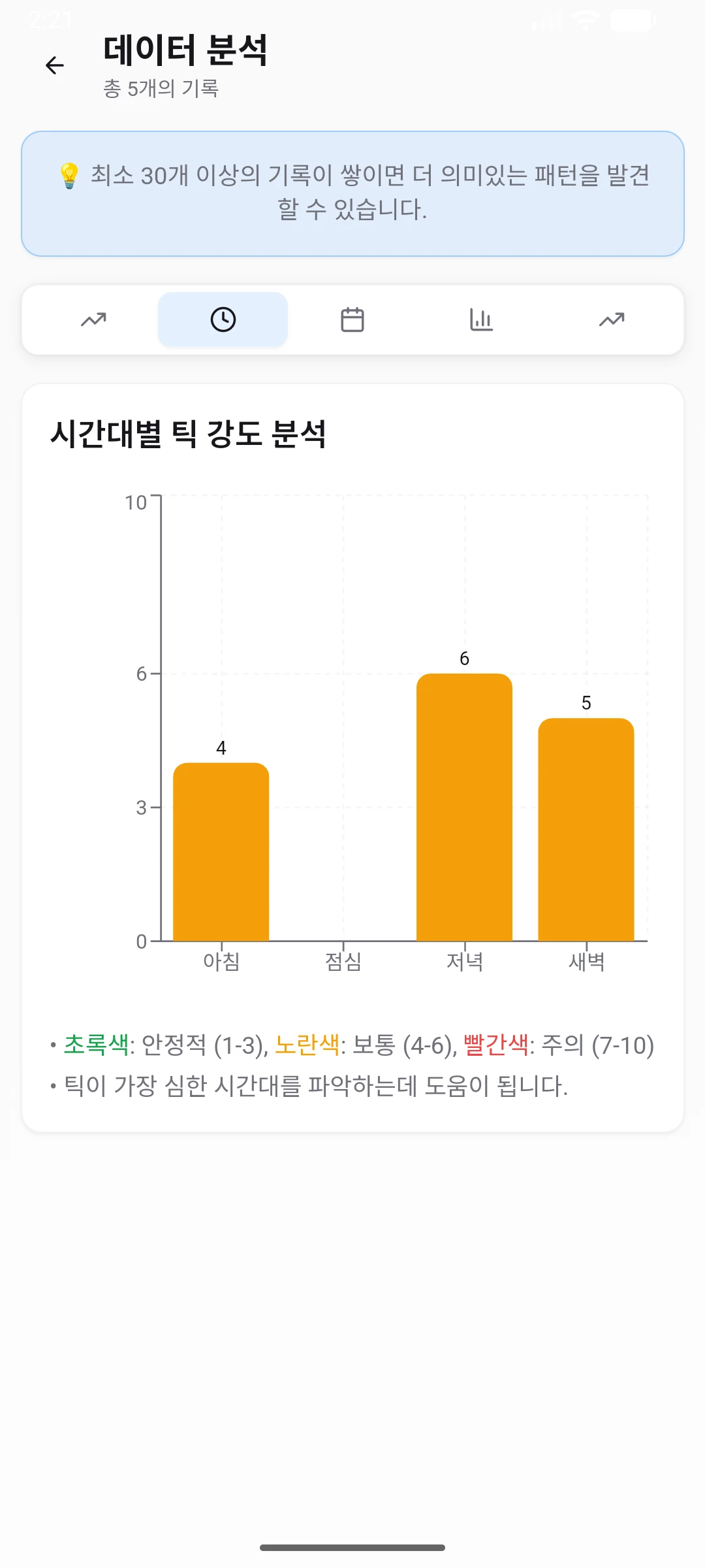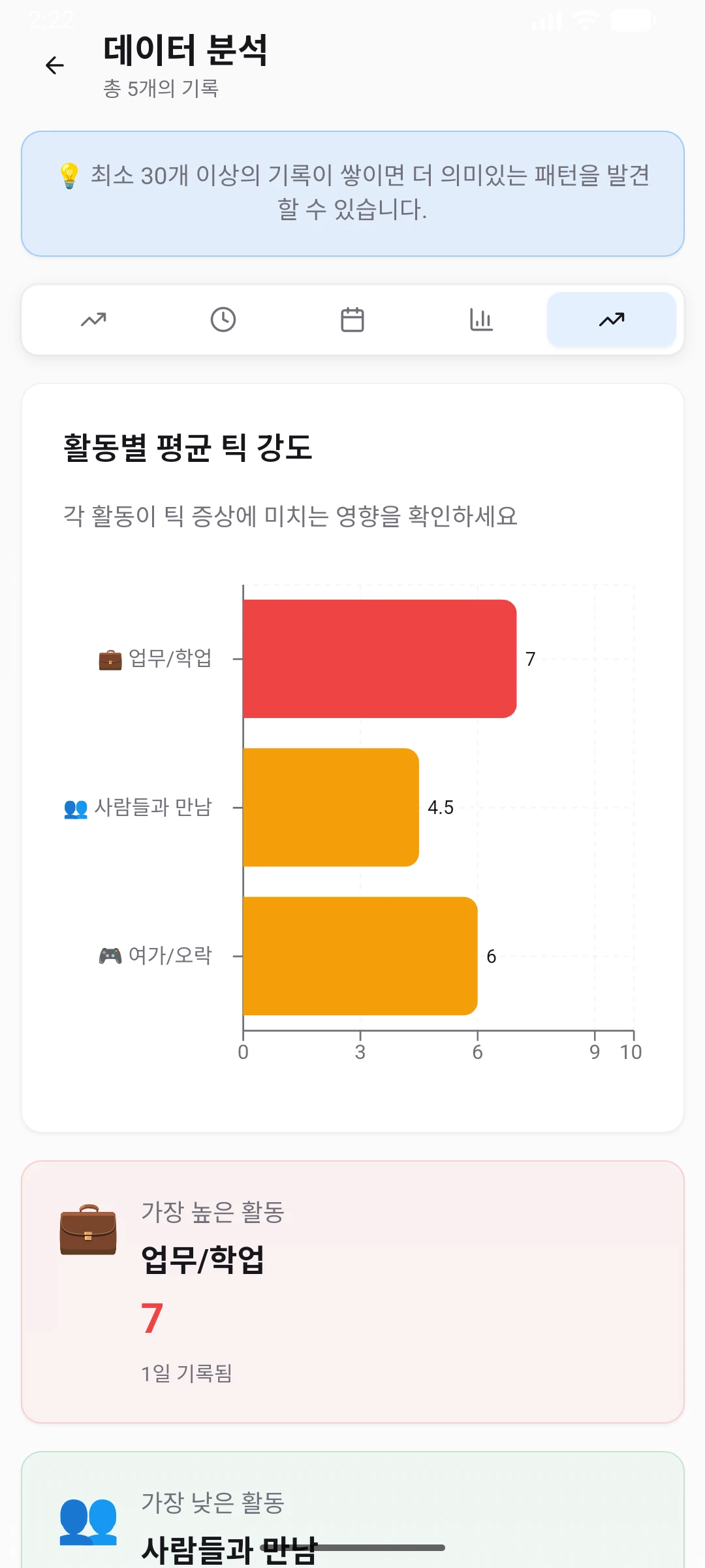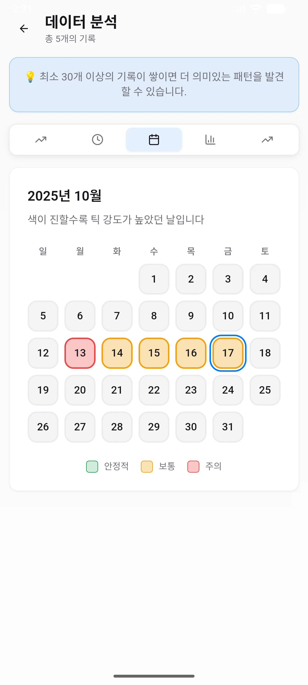 매일의 기록을 통해 무엇이 나의 틱을 편안하게 하는지, 또 어떤 순간에 힘들어지는지 발견해 보세요. 그 기록들이 모여 당신만의 틱 관리 지도가 될 것입니다.