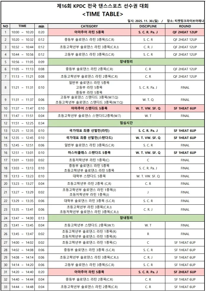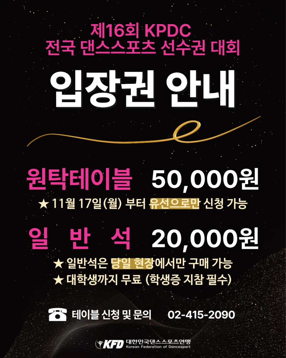 제16회 KPDC 전국 댄스스포츠 선수권 대회 일시: 2025년 11월 30일(일) 장소: 티켓링크라이브아레나(구 SK핸드볼경기장) 주최: 대한민국댄스스포츠연맹 국내에서 가장 큰 대회입니다. 함께 관람 하실 분들은 출석을 눌러 주세요.