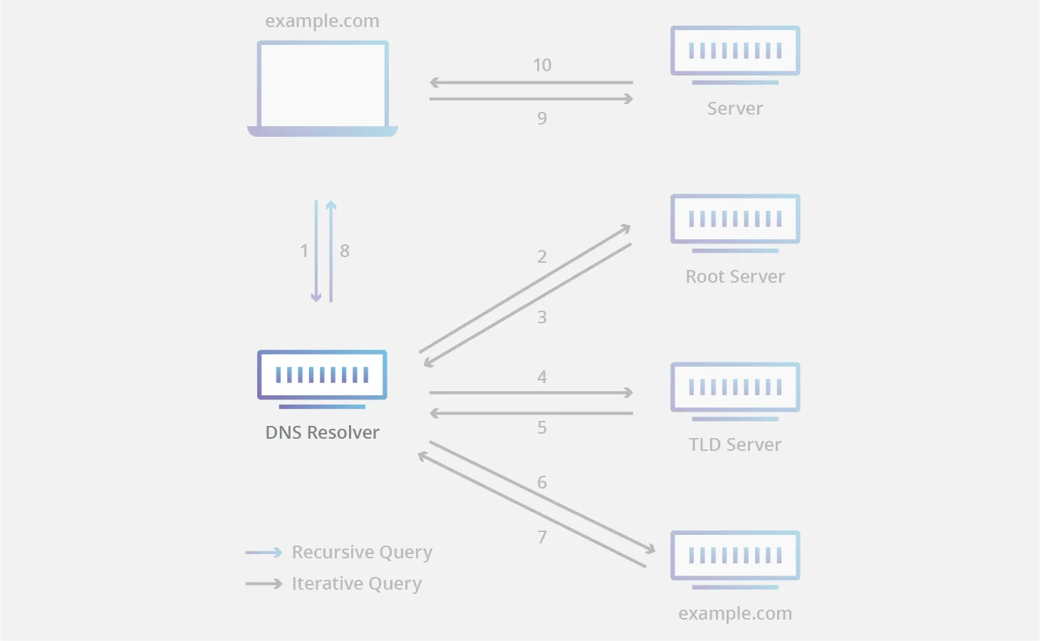 DNS는 Domain Name을 IP로 변환해주는 시스템이다. 가령 브라우저에서 google.com을 검색하면 브라우저는 이를 DNS 서버에 보내고, google.com 도메인에 해당하는 IP를 받는다. 브라우저는 이 IP를 이용해 google.com 서버와 패킷을 주고 받는다. "아하! DNS는 도메인을 IP로 변환해주는 거구나!" 라고 이해해도 문제는 없지만... 도메인을 등록하다 보면 네임서버, ISP, TLD 등 생소한 단어들이 보인다. 이것들은 뭘까? 이들은 DNS를 구성하는 요소들로, 오늘 이야기 할 주제이다. 용어 정리 TLD (Top-Level-Domain) 도메인 이름의 마지막 마침표 뒤에 오는 부분을 뜻함. 같은 맥락에서 2LD는 TLD 앞에 오는 부분을 말함. 예를 들어 google.co.uk에서 TLD는 uk 2LD는 co 3LD는 google임 ISP (Internet Service Provider) SKT, KT, LG U+ 등을 말한다. 일반적으로 DNS Resolver를 제공한다. ICANN (Internet Corporation for Assigned Names and Numbers) 이름 그대로 해석하면 국제 인터넷 주소 관리 기구다. 수많은 컴퓨터가 함께 통신하기 위해서는 고유한 식별자가 있어야 한다. ICANN은 이러한 식별자 시스템을 감독한다 DNS가 동작하는 방식 클라이언트에서는 ISP가 제공하는 DNS Resolver로 요청을 보낸다. DNS Resolver는 Root Server로 요청으로 보낸다. Root Server는 ICANN이 관리한다. 각 TLD에 해당하는 TLD Server 정보를 알고 있다.